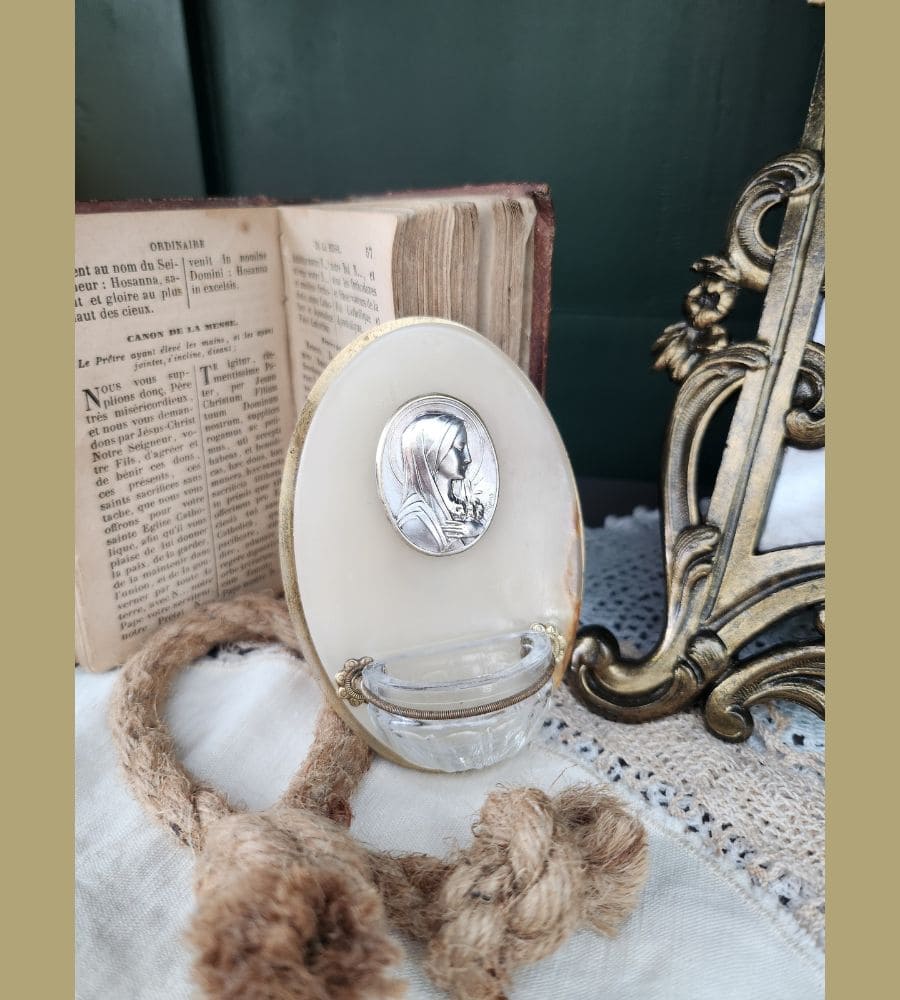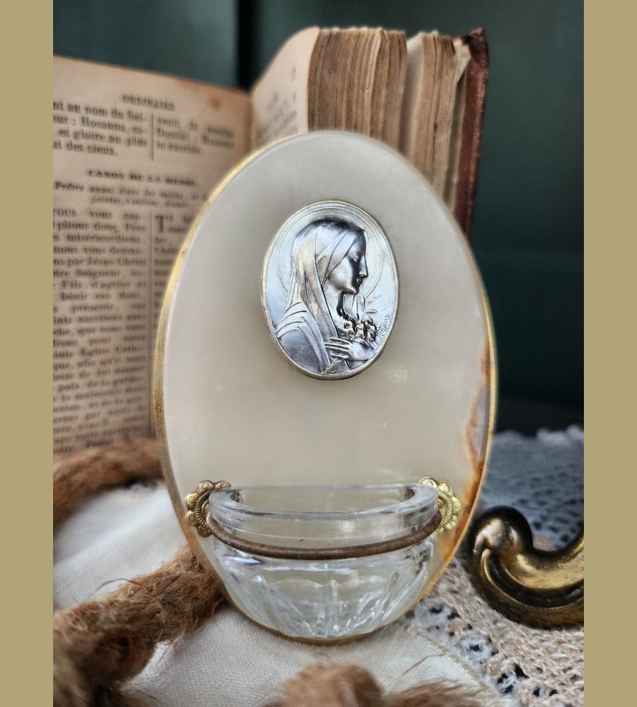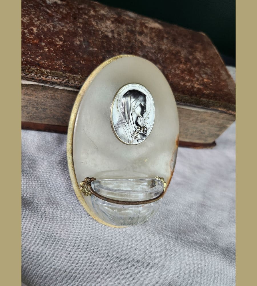 Ancien petit bénitier dit bénitier de chevet, avec médaillon de la vierge Marie signé « Ruffony ».