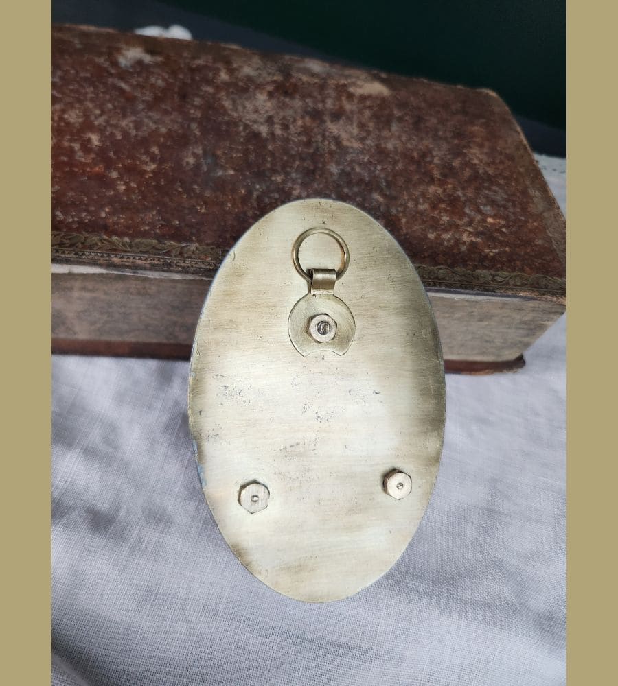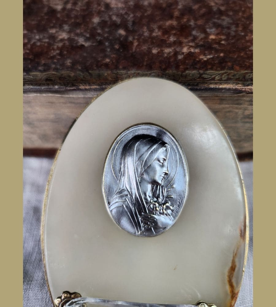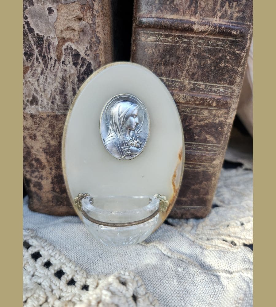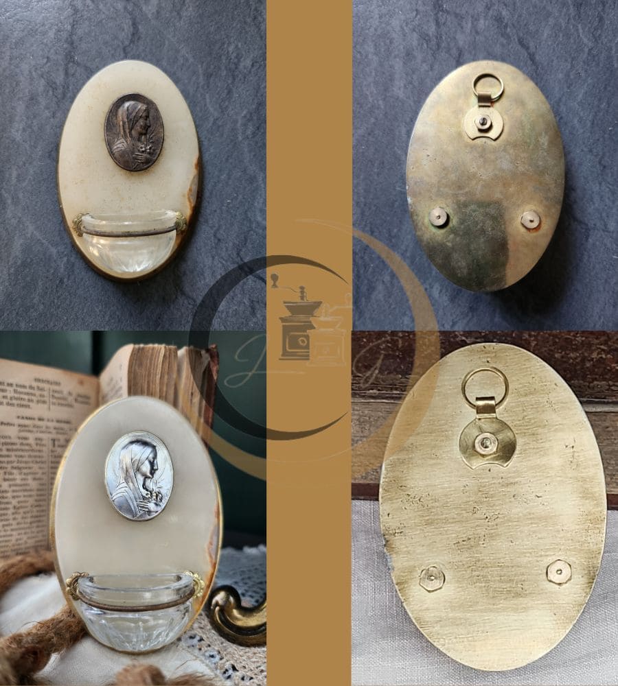 Ancien petit bénitier dit bénitier de chevet, avec médaillon de la vierge Marie signé « Ruffony ».