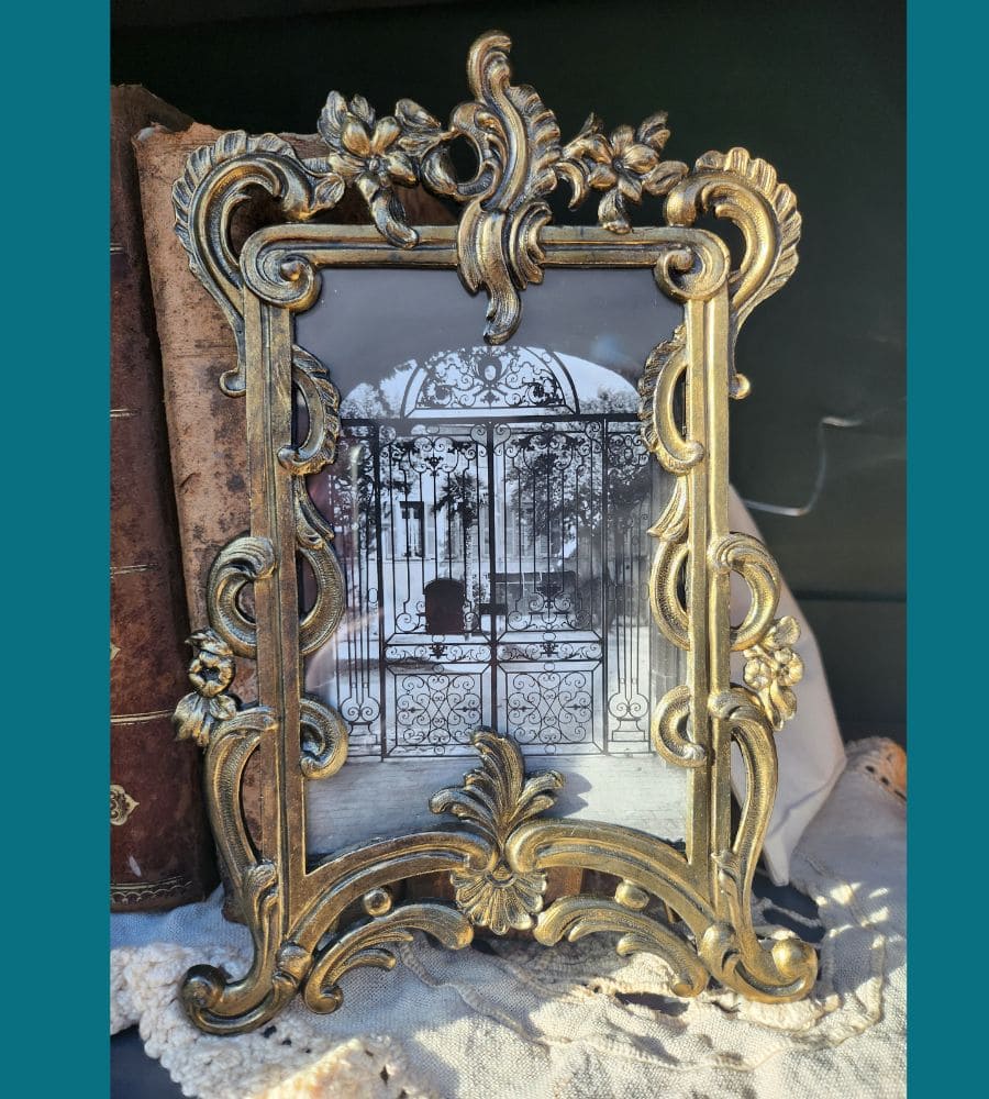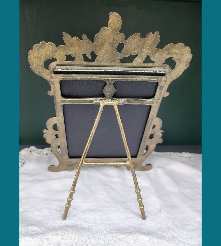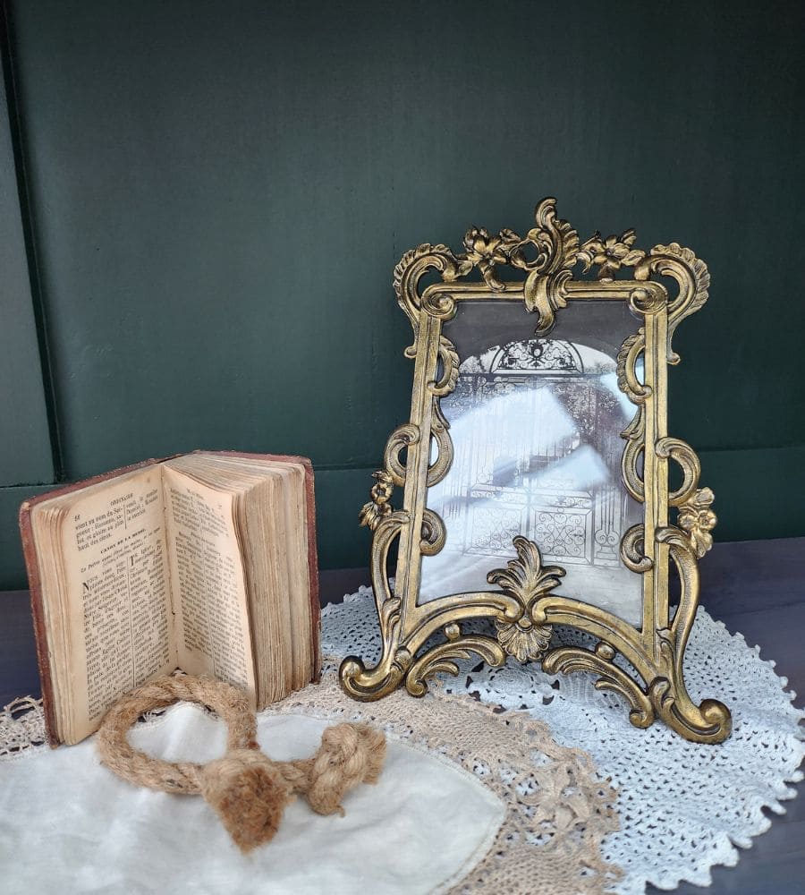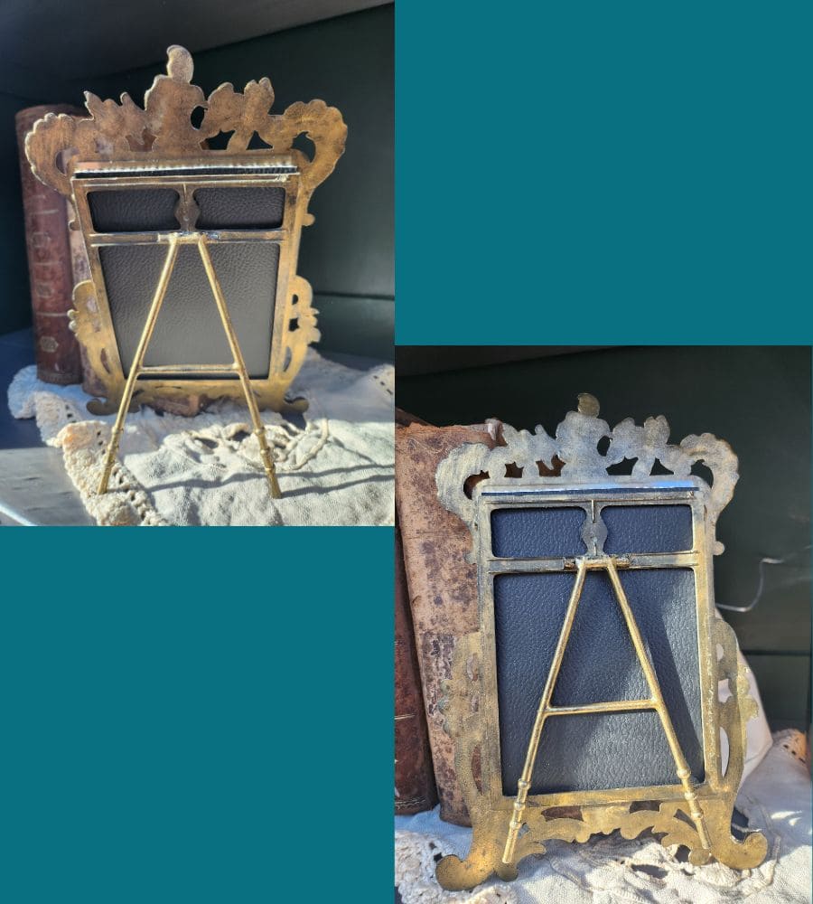 Cet ancien cadre à poser est prêt à accueillir vos photos préférées. Il est ici proposé avec son verre et une ancienne carte postale noir et blanc.