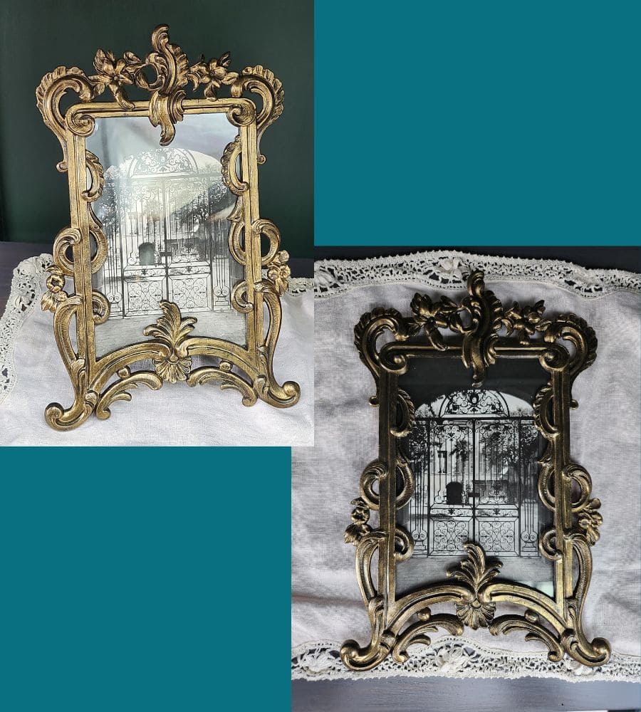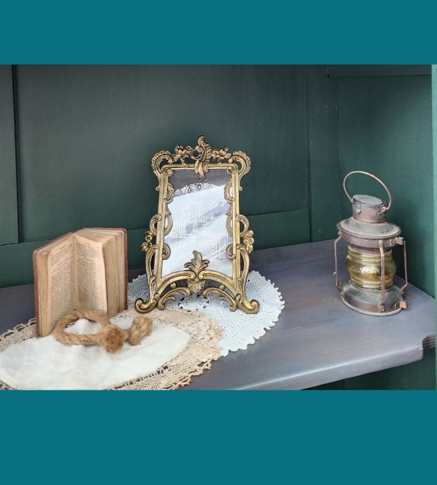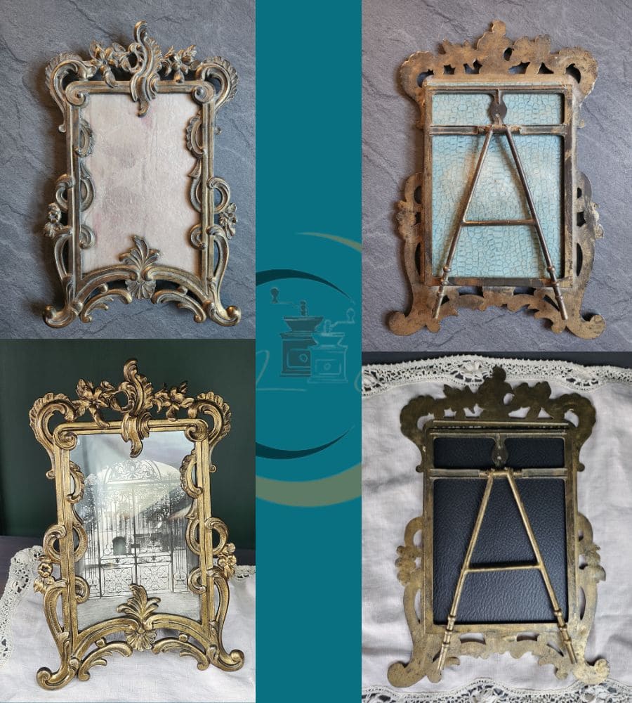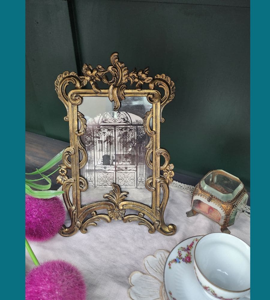 Cet ancien cadre à poser est prêt à accueillir vos photos préférées. Il est ici proposé avec son verre et une ancienne carte postale noir et blanc.