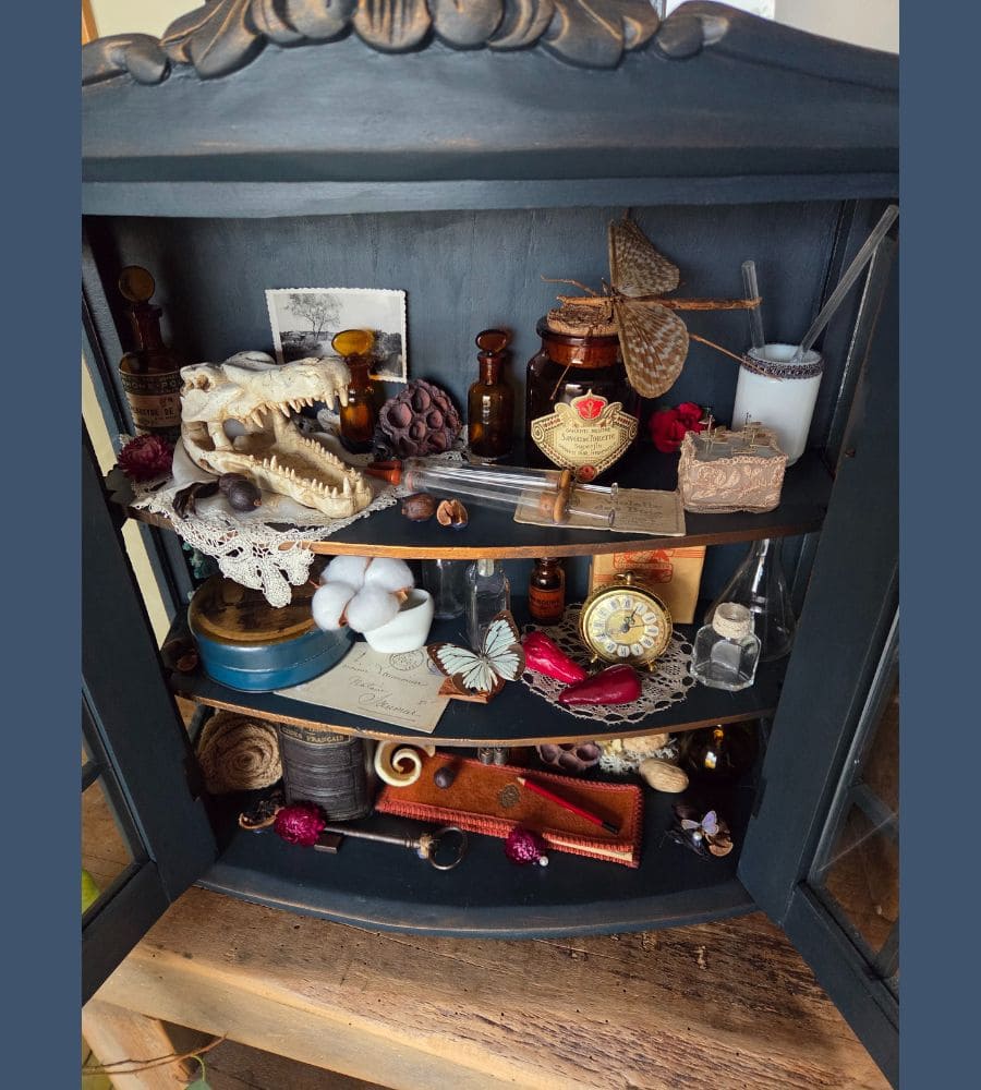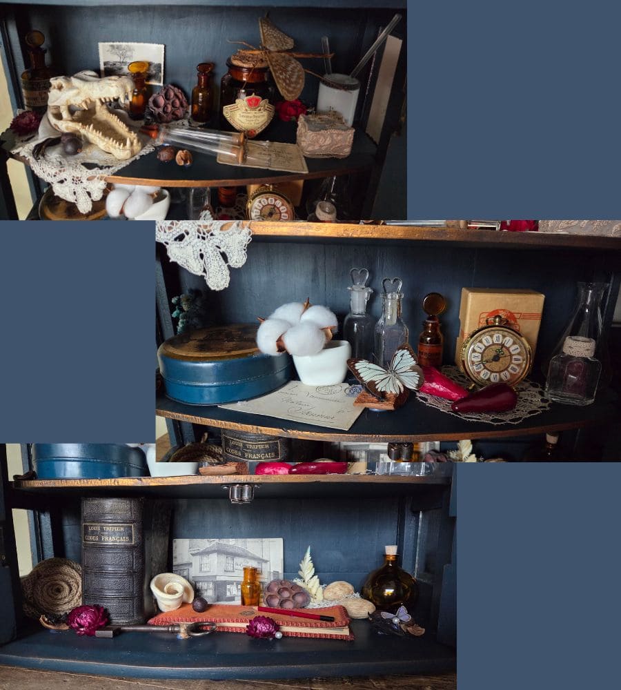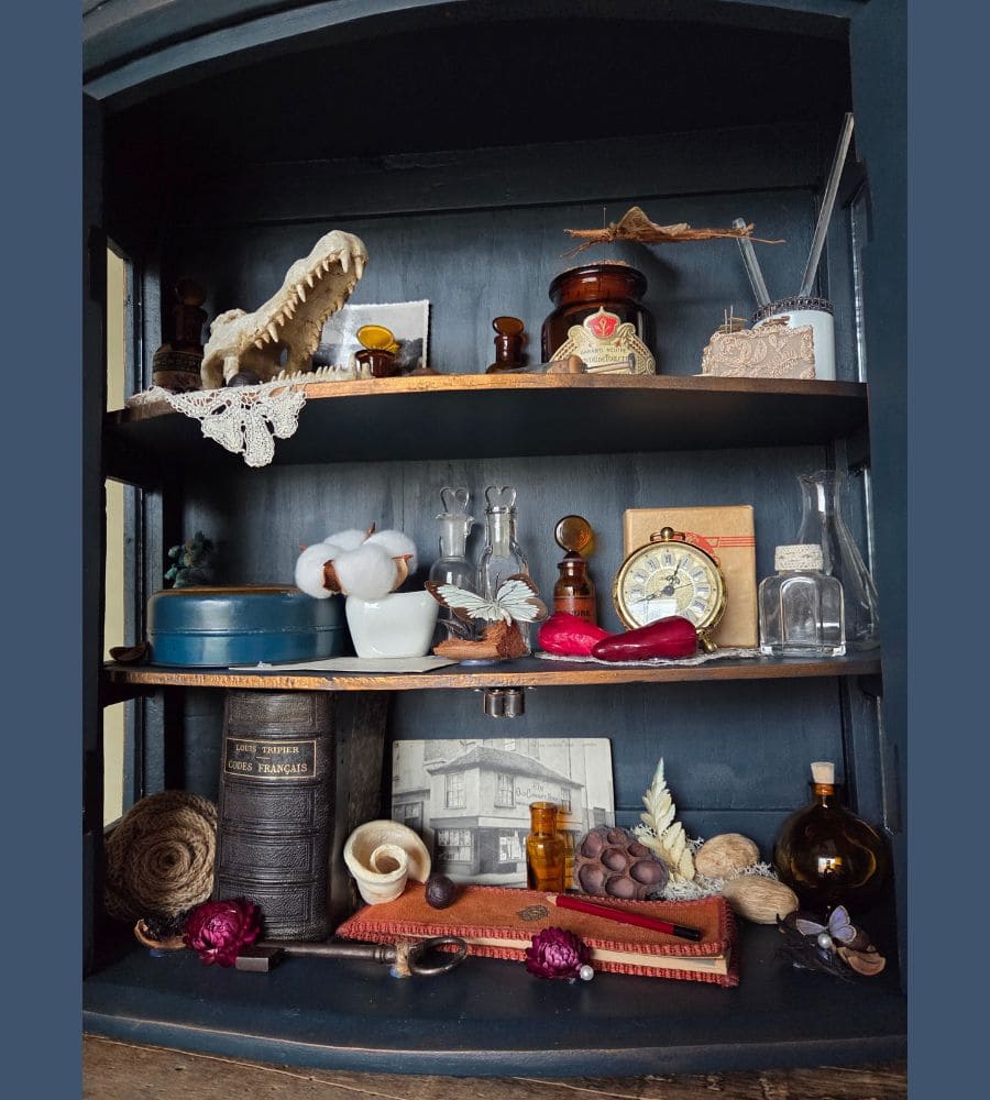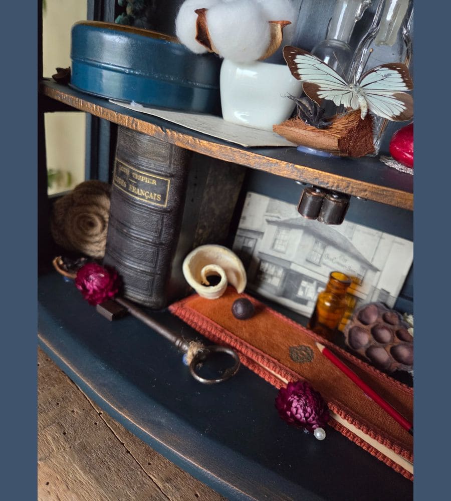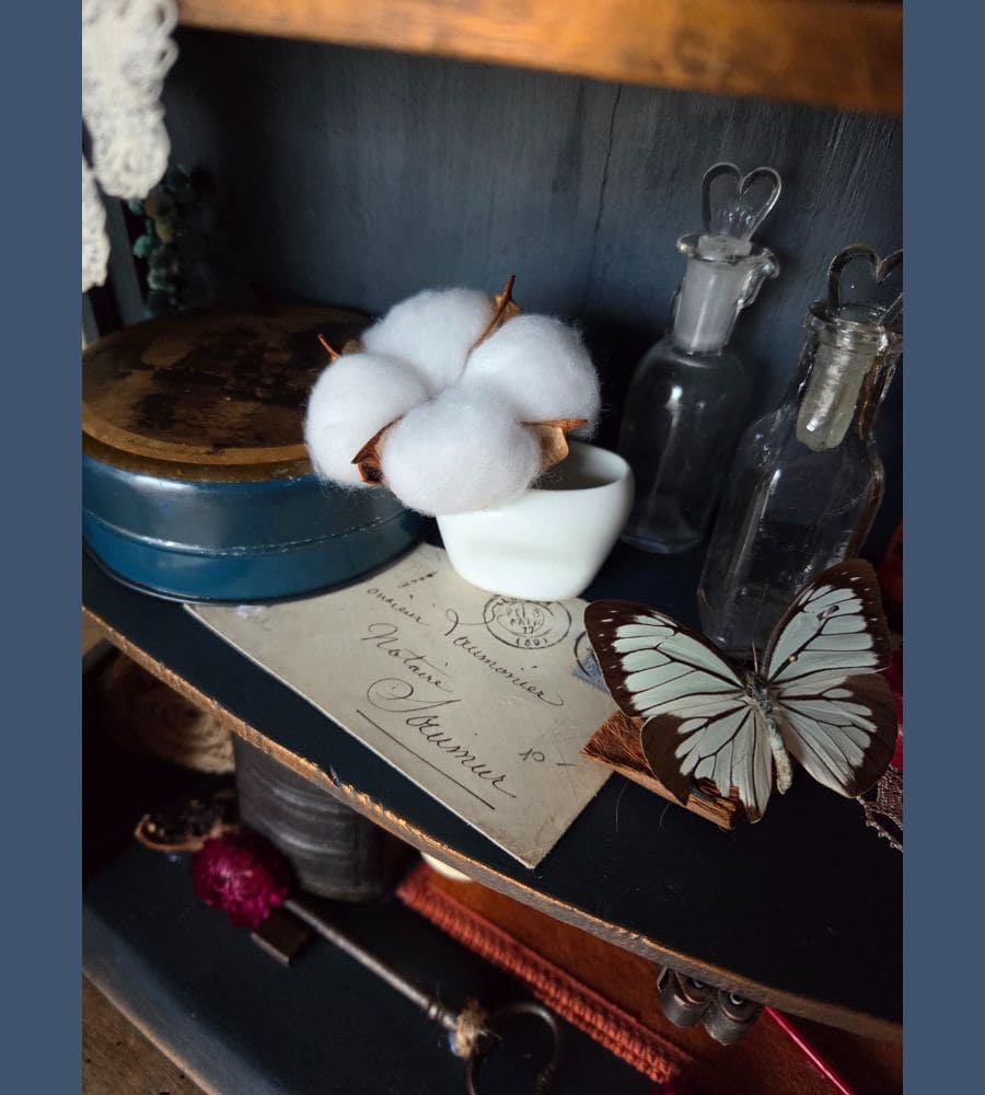 Chaque objet de cette ancienne vitrine revalorisée a été chiné et soigneusement préparé pour vous présenter ce théâtre silencieux où le passé dialogue avec l’imaginaire.