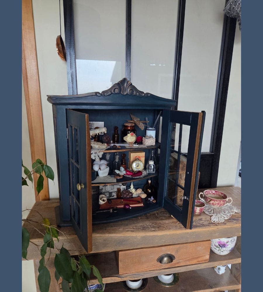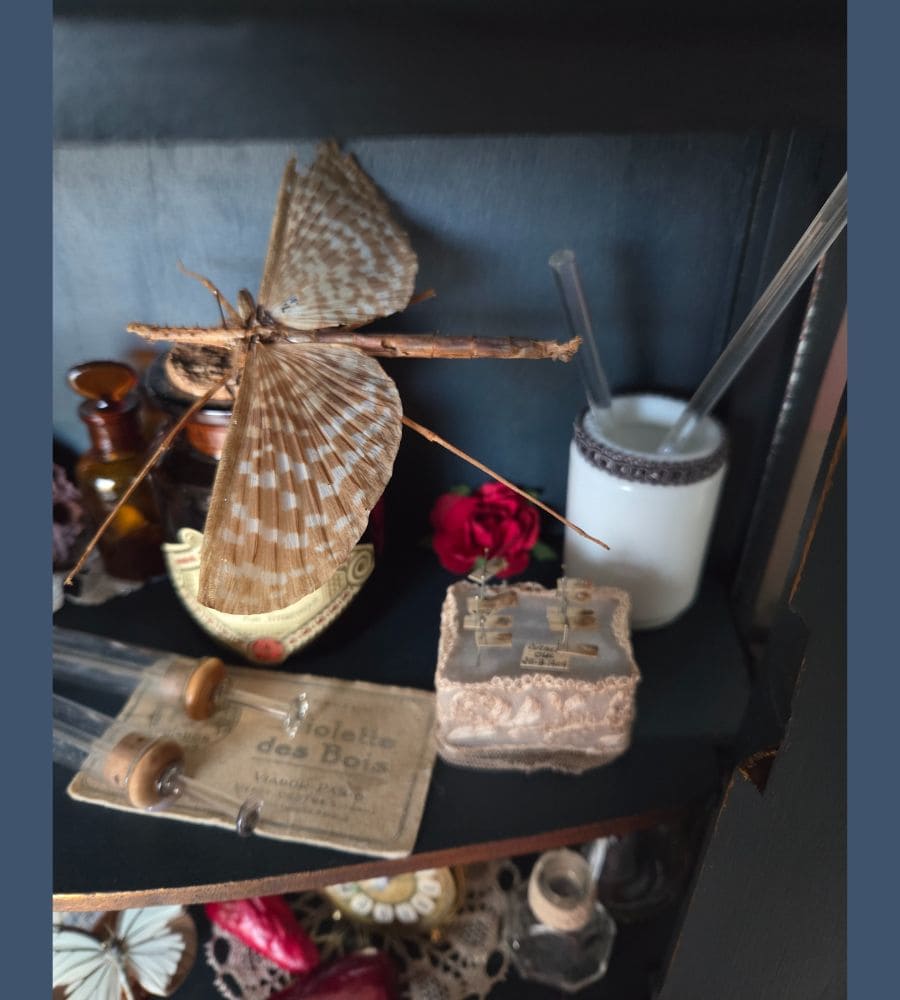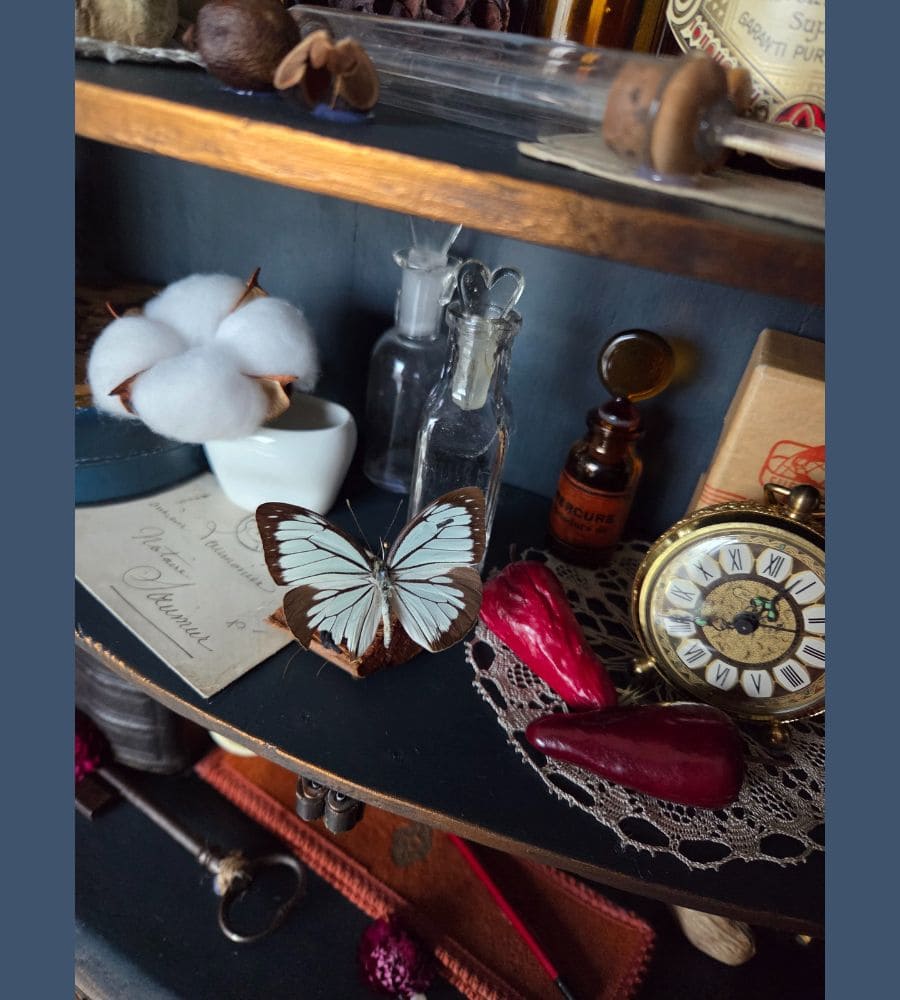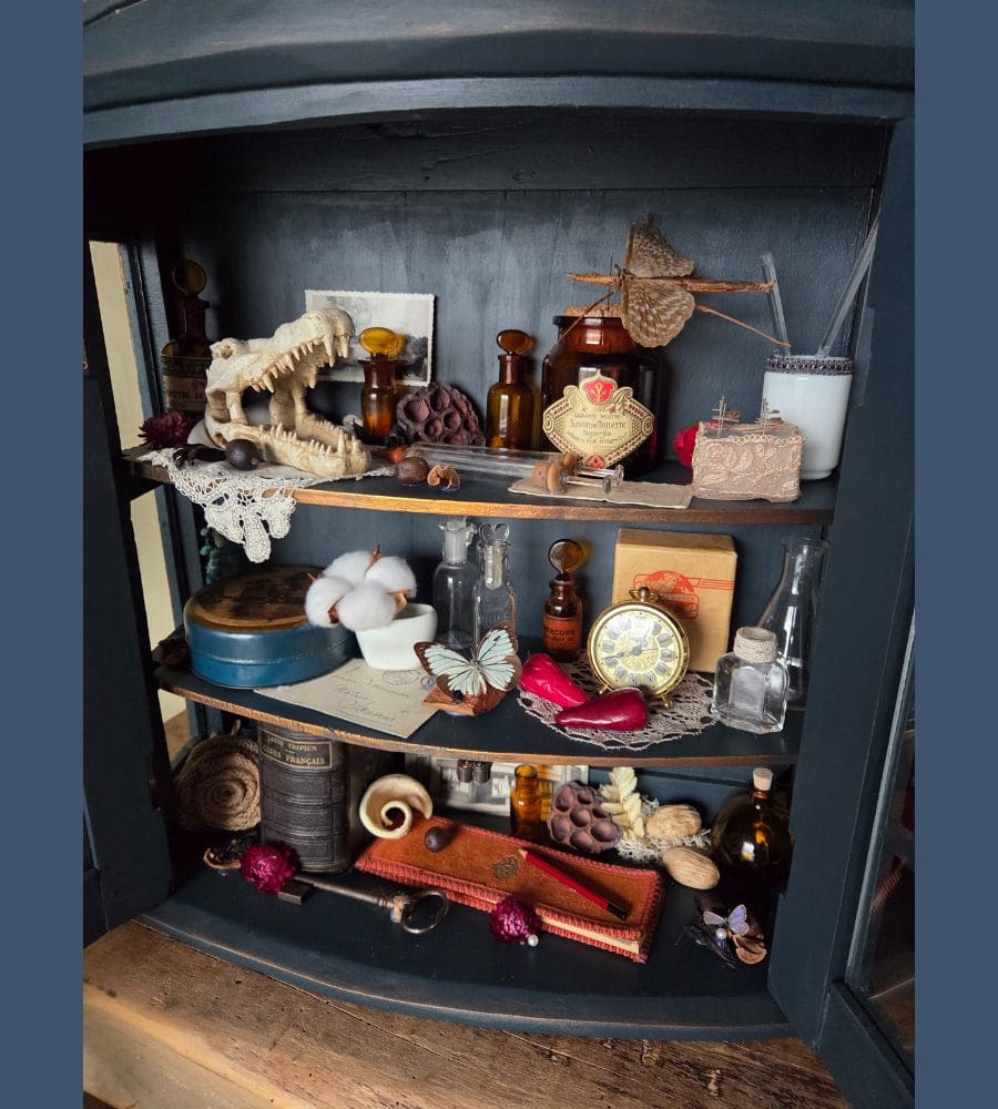 Chaque objet de cette ancienne vitrine revalorisée a été chiné et soigneusement préparé pour vous présenter ce théâtre silencieux où le passé dialogue avec l’imaginaire.
