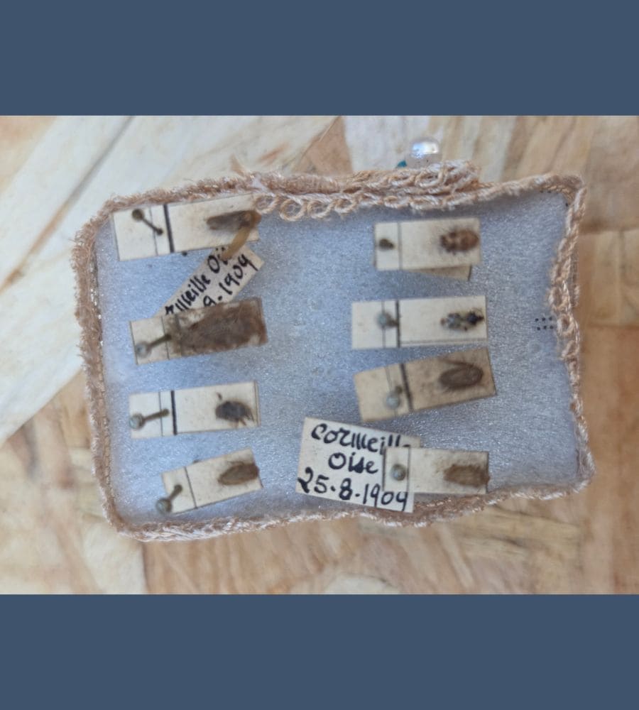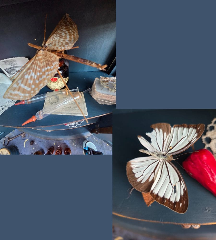 (Anciens flacons et pots de pharmacie, entomologie ancienne, papillons naturalisés, réveil et sa boite, reproduction animalière en plâtre, ancien cliché et carte postale, seringues d’époque en verre, vieux livre de codes français, carnet avec sa couverture velours, une boite en fer, clé ancienne…).