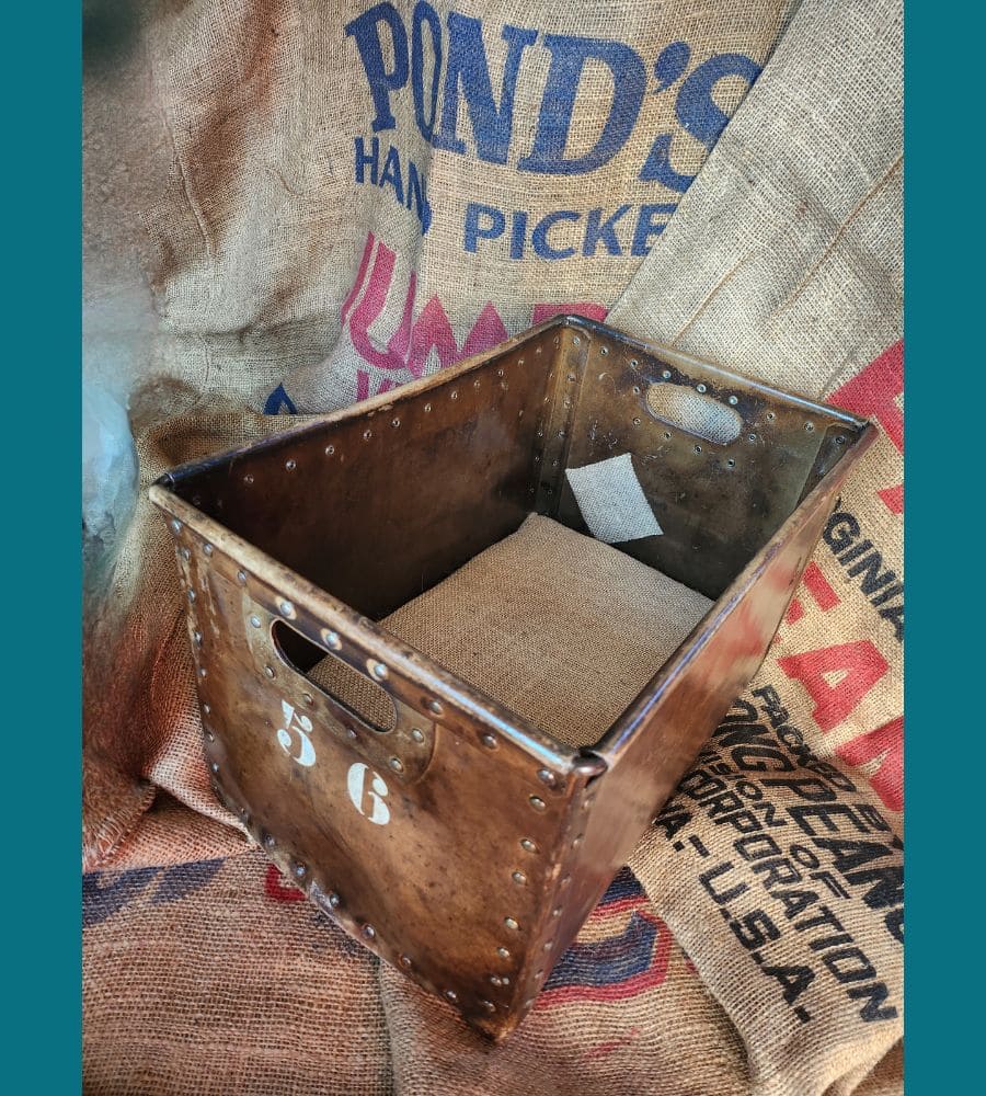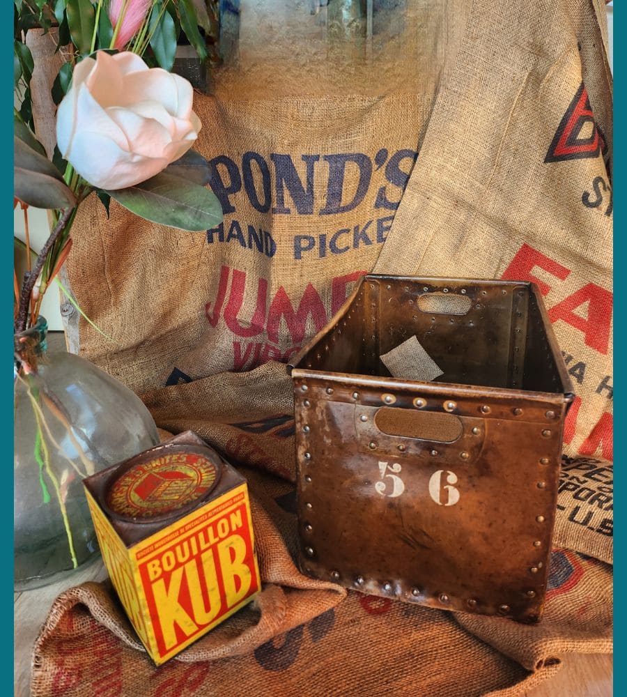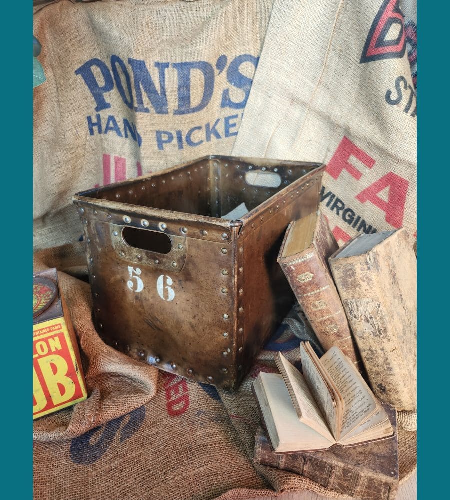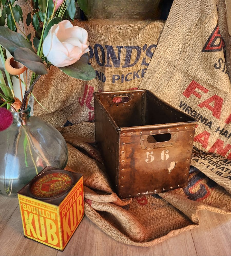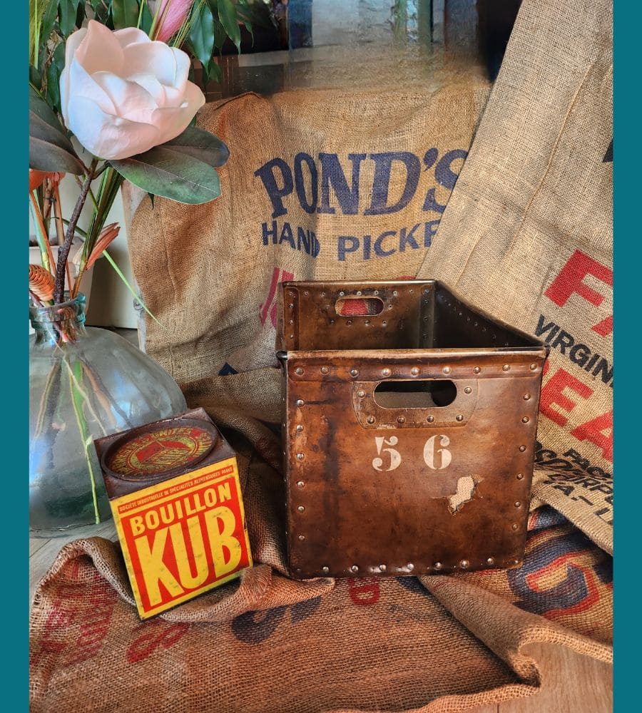 Elle provient d’un ancien atelier de tissage. Cette caisse a traversé quelques années, non sans encombre, mais ses marques du temps, bien visibles sur les photos, lui donnent toute son authenticité. Malgré les années passées, elle reste très solide avec ses renforts en bois (d’origine!) sur le dessous. Elle rappelle les caisses Suroy par son style et conception.