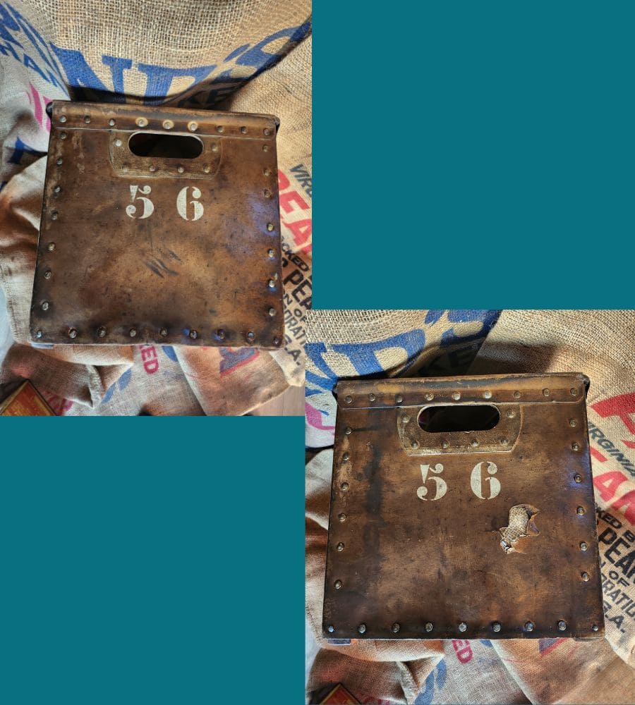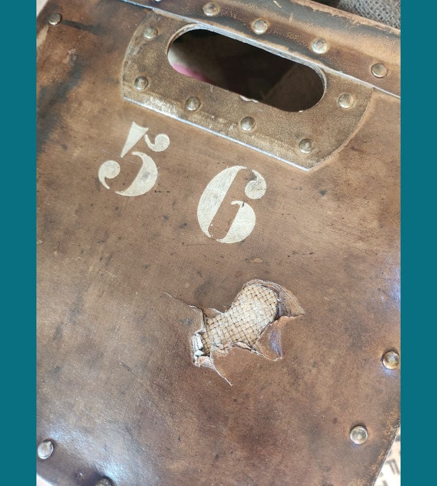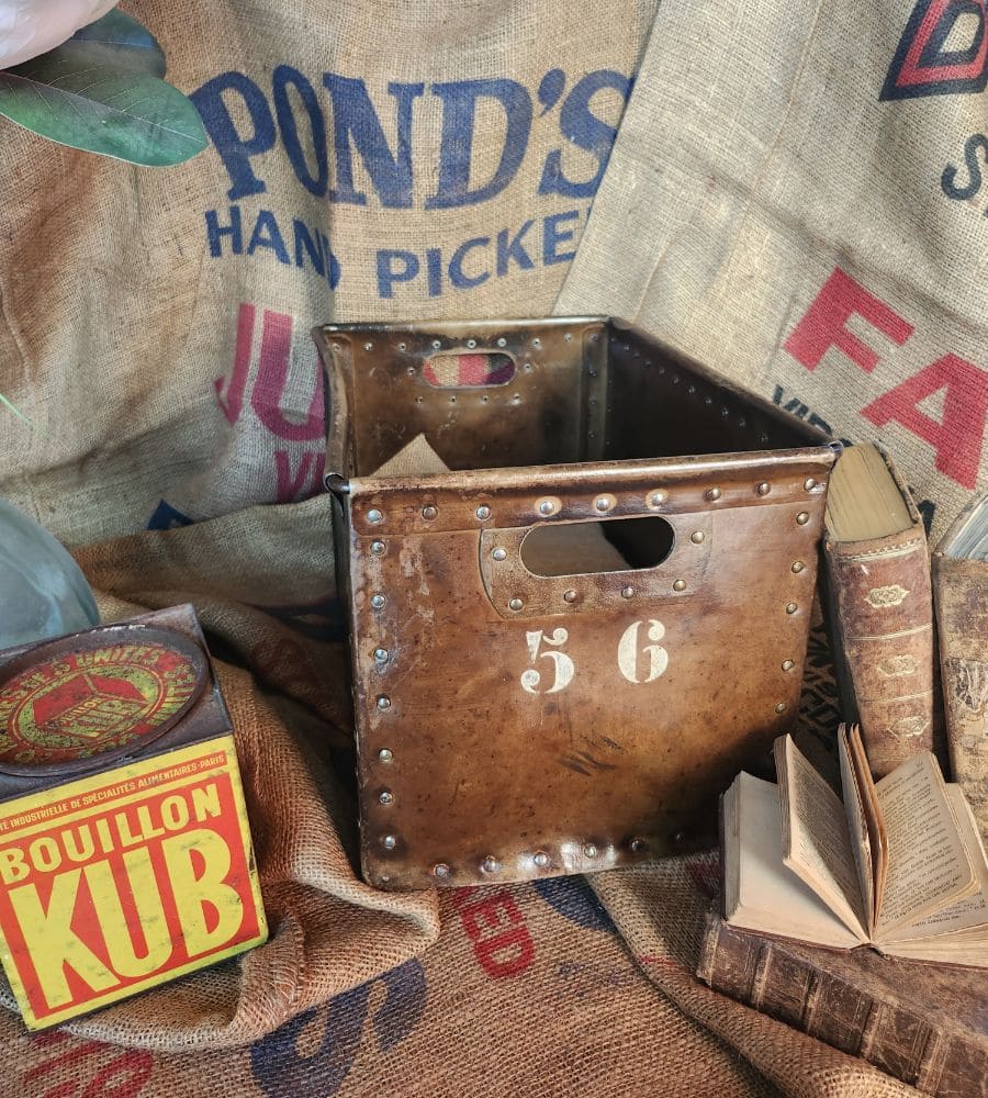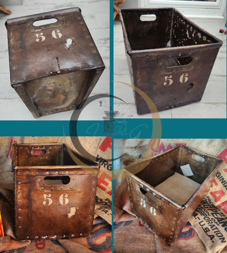 Cette caisse en carton vulcanisé également appelé carton bouilli (matière utilisée à l’époque pour les fameuses valises en carton) porte le numéro 56 de chaque côté sous les poignées.