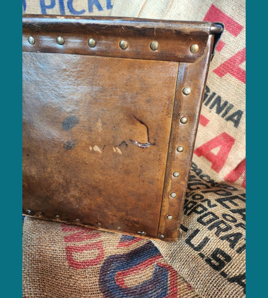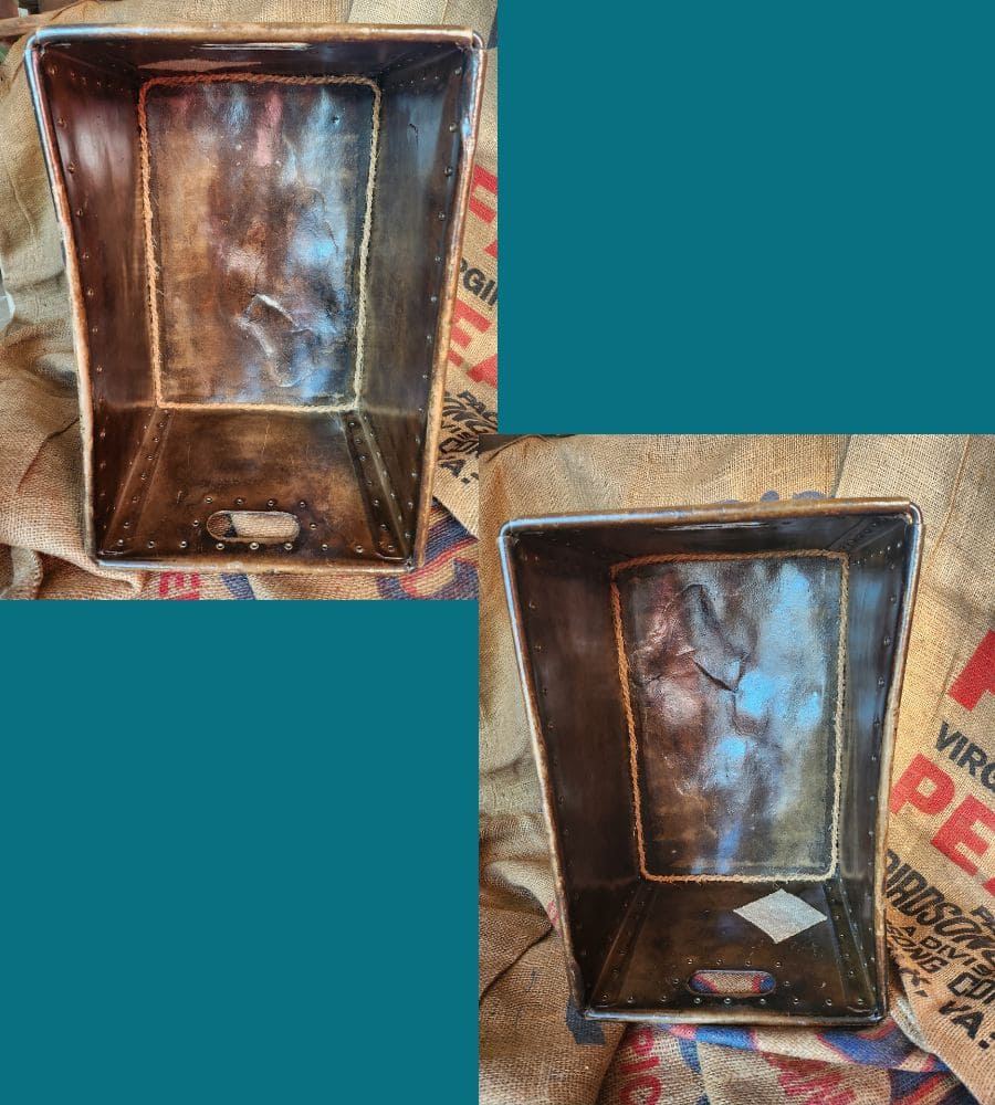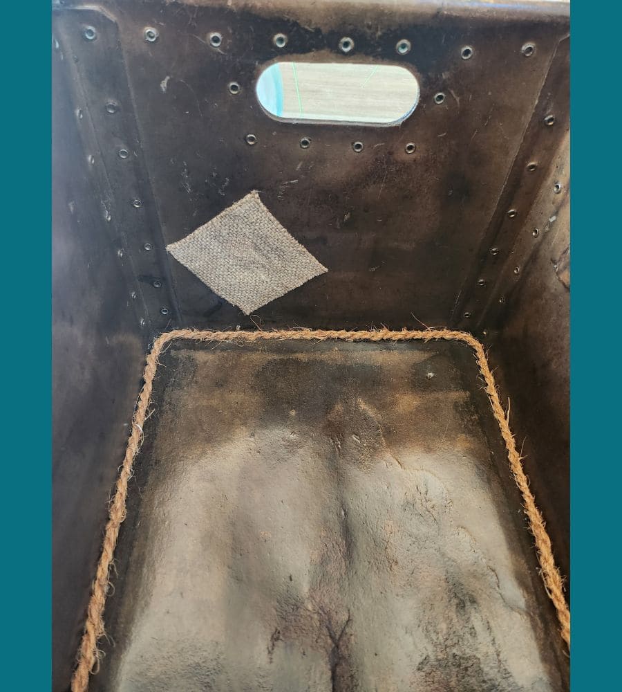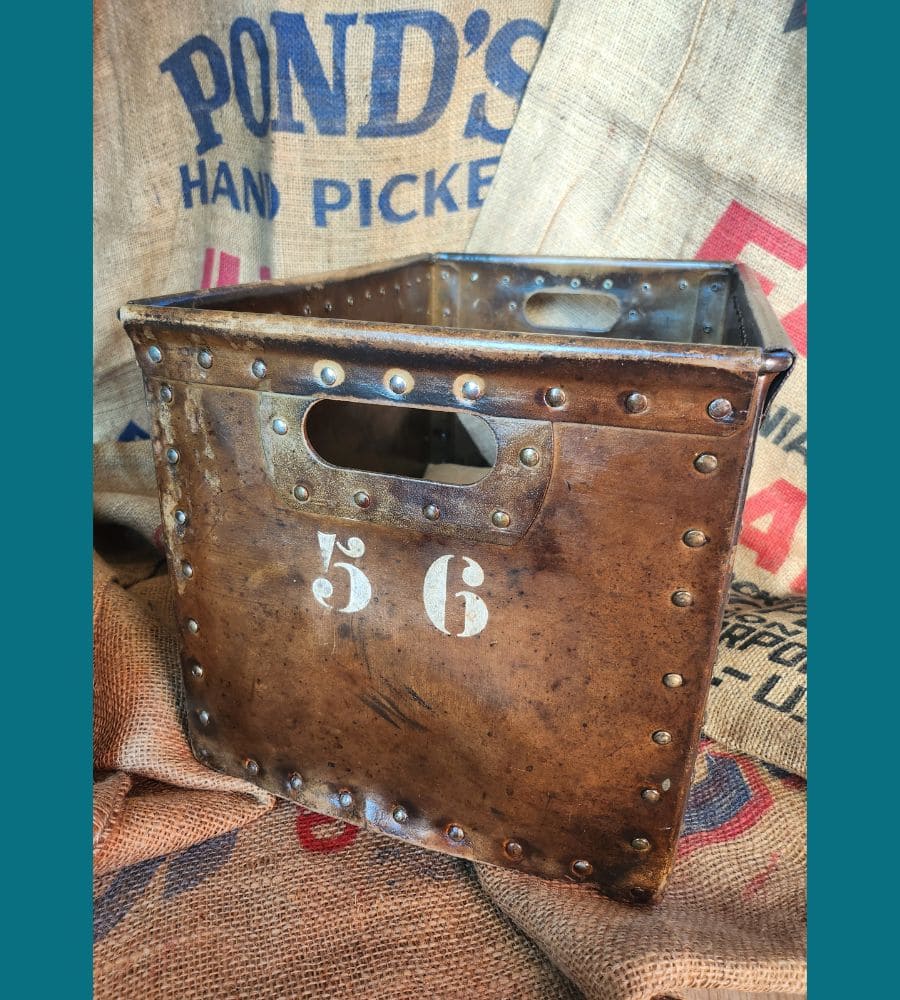 Cette caisse en carton vulcanisé également appelé carton bouilli (matière utilisée à l’époque pour les fameuses valises en carton) porte le numéro 56 de chaque côté sous les poignées.