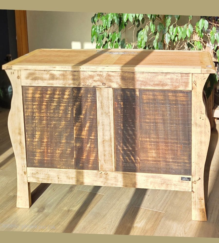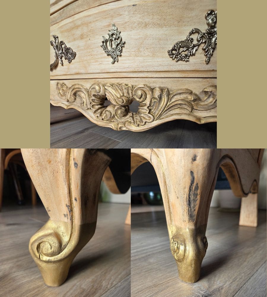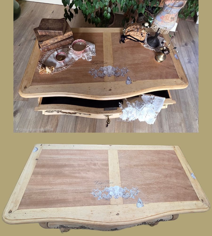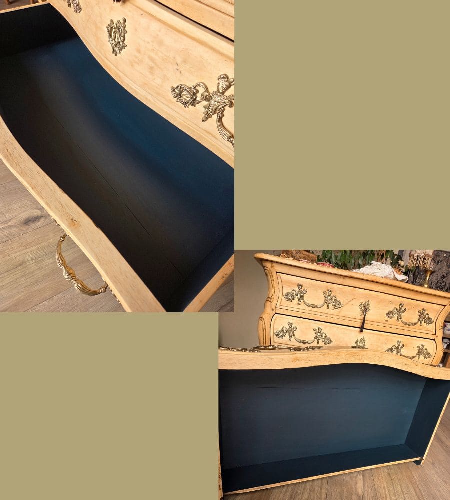 À l’intérieur, les tiroirs et le coffre ont été peints avec une peinture minérale dans un bleu-vert profond. Une patine à la cire dorée et un transfert discret viennent souligner le charme naturel du meuble, sans le dénaturer.