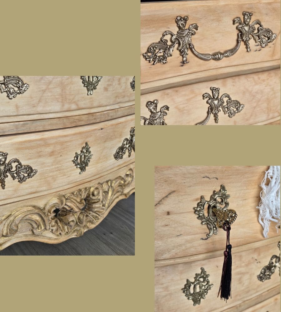 La commode dispose de 3 tiroirs qui coulissent parfaitement. Ils sont agrémentés de leurs poignées et garnitures d’origine en laiton, nettoyées avec soin. La serrure du premier tiroir est fonctionnelle.