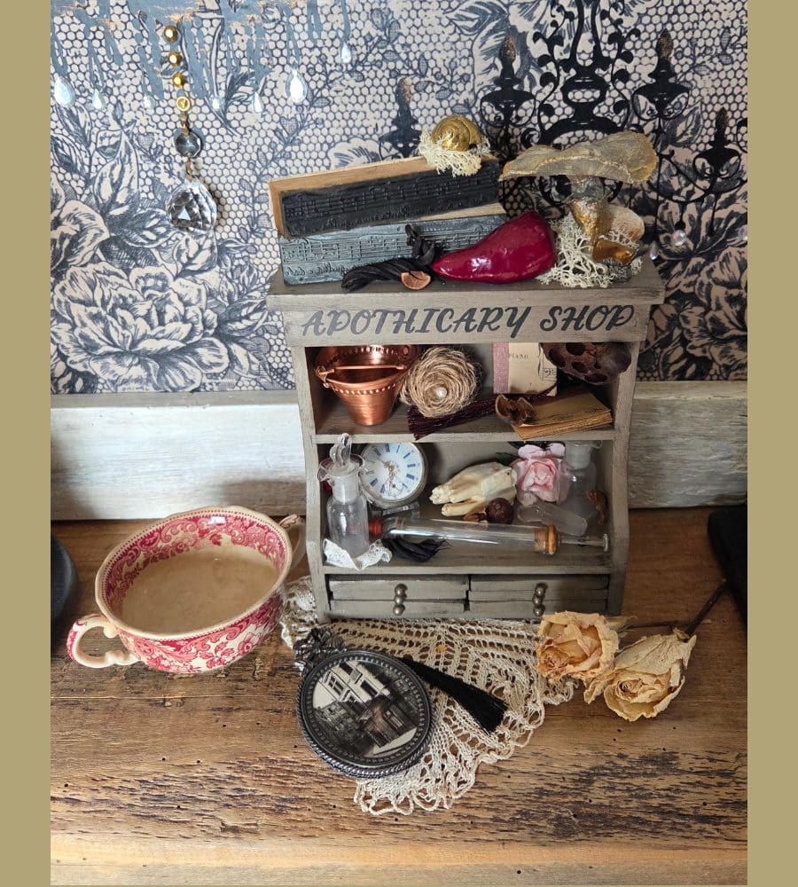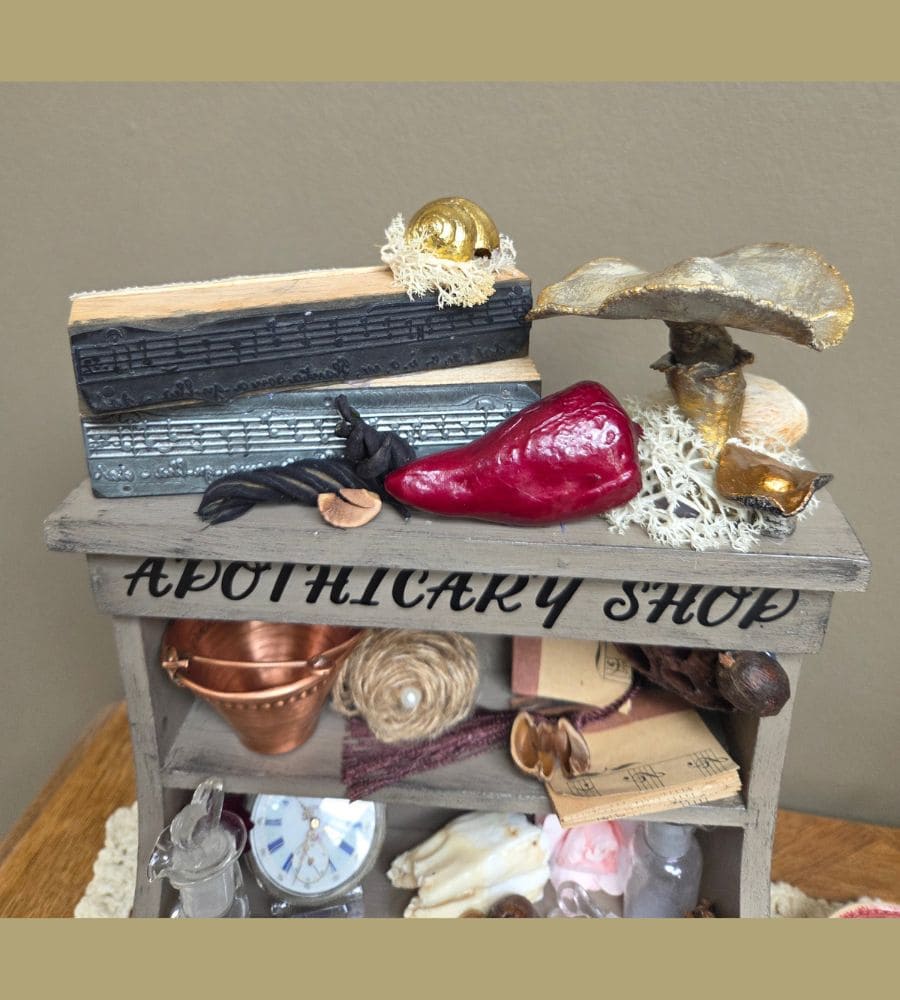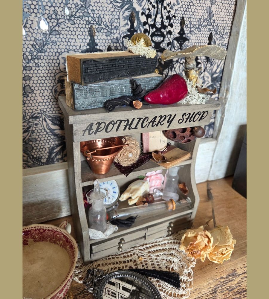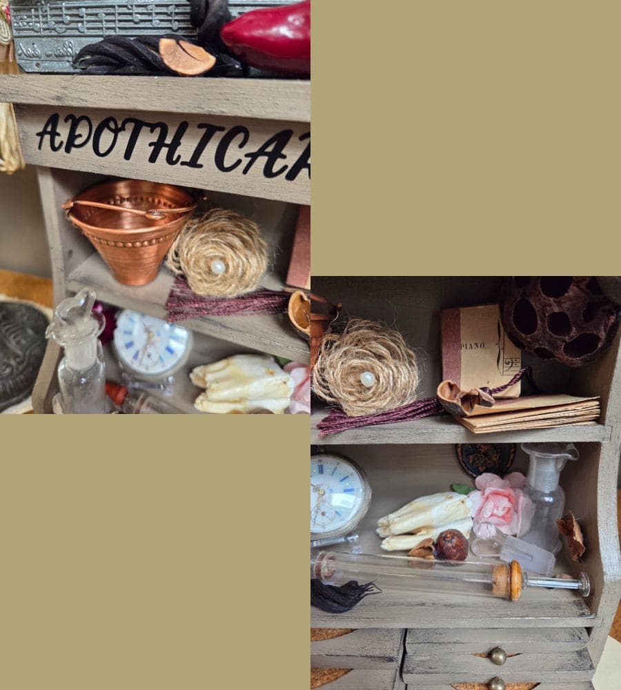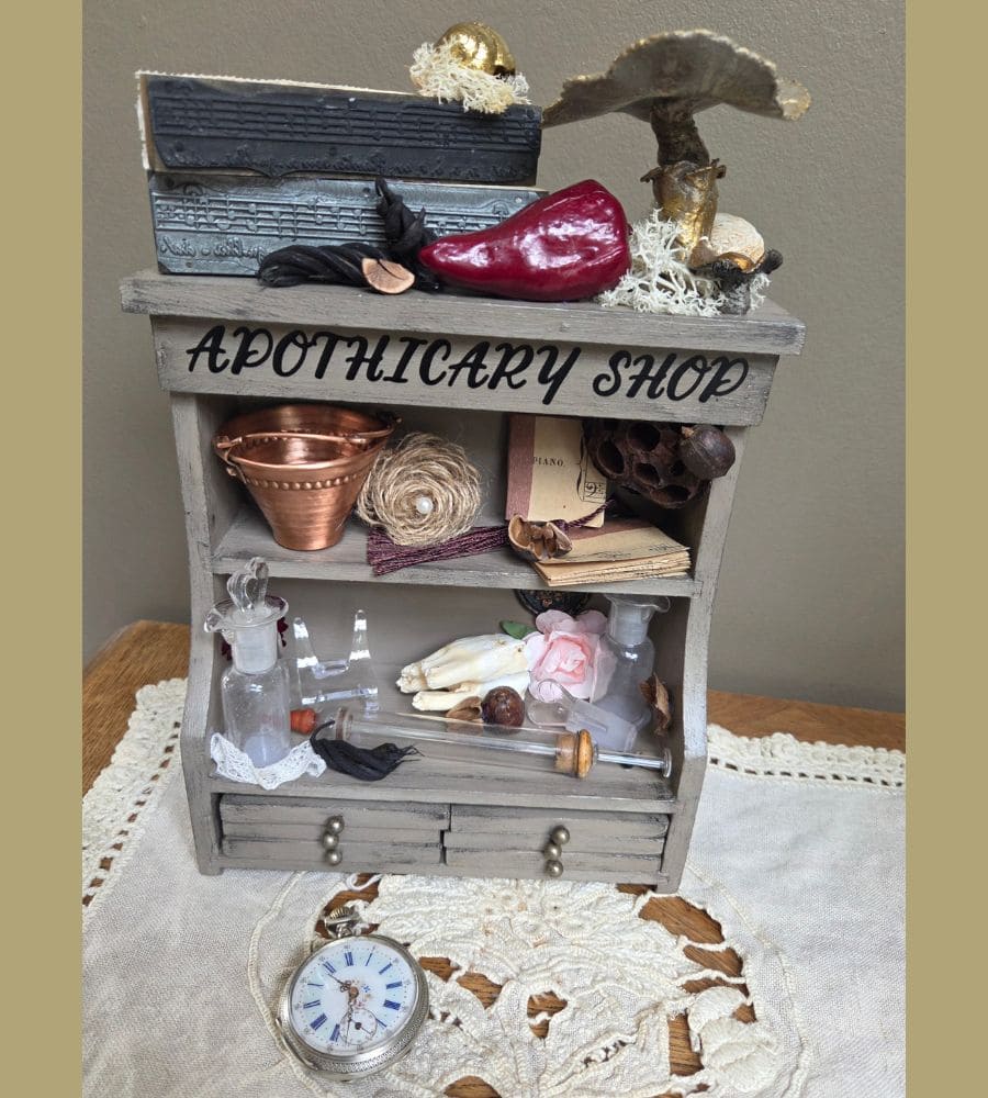 Et plusieurs créations artisanales : mini partitions de musique, fleur en jute, décor d’horloge, transfert « apothicary shop », etc.