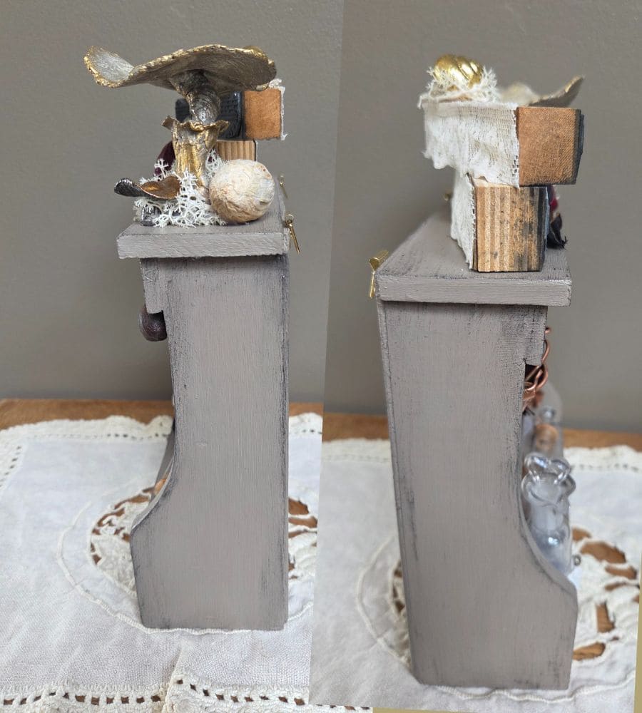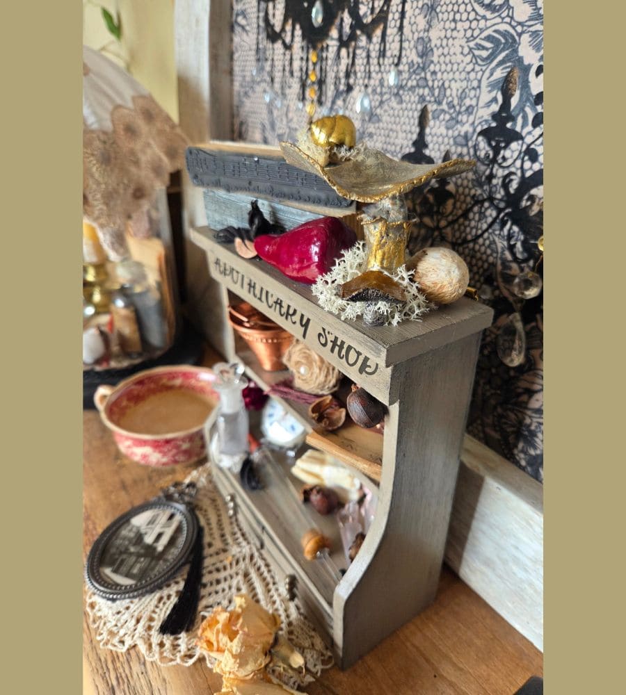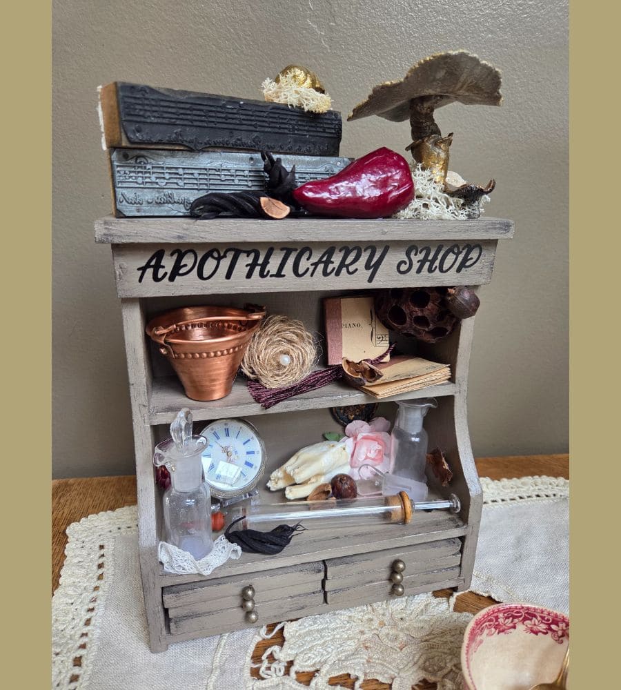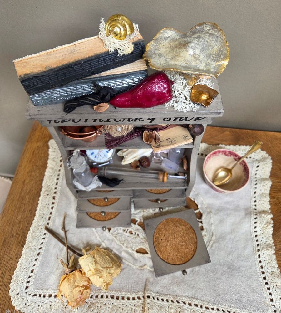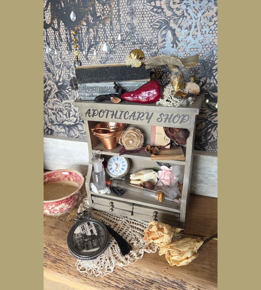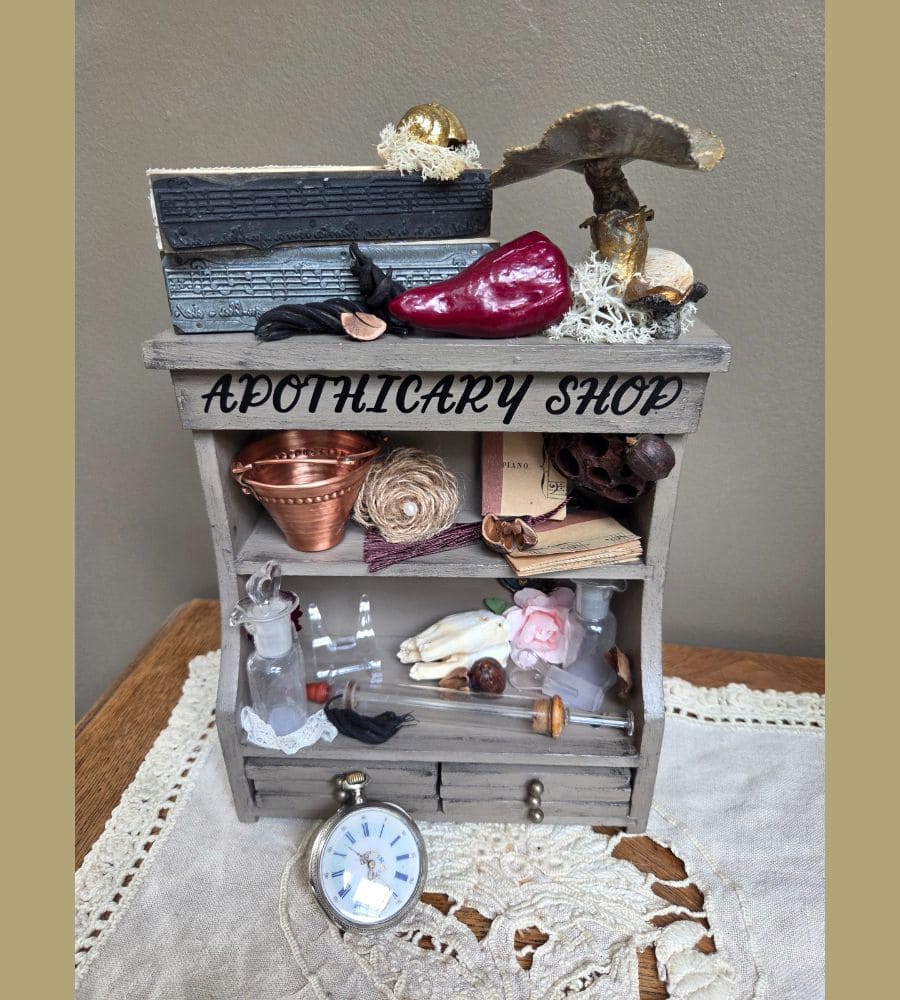 Et plusieurs créations artisanales : mini partitions de musique, fleur en jute, décor d’horloge, transfert « apothicary shop », etc.