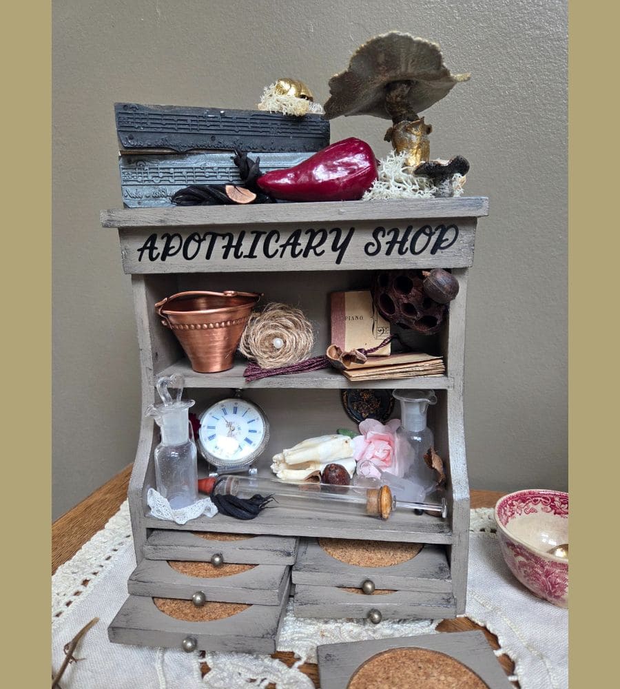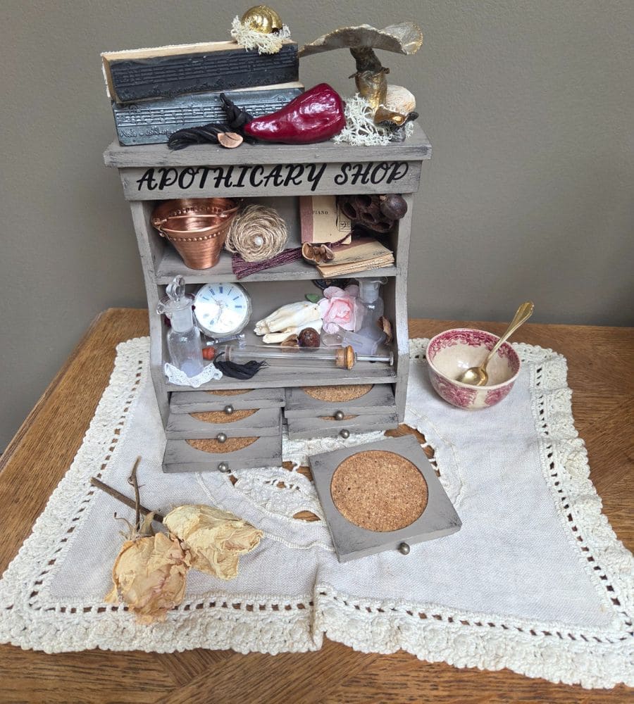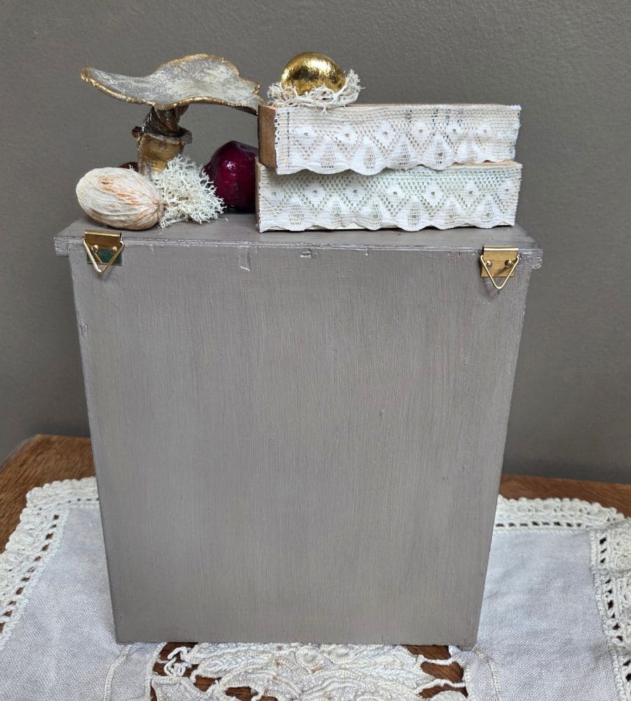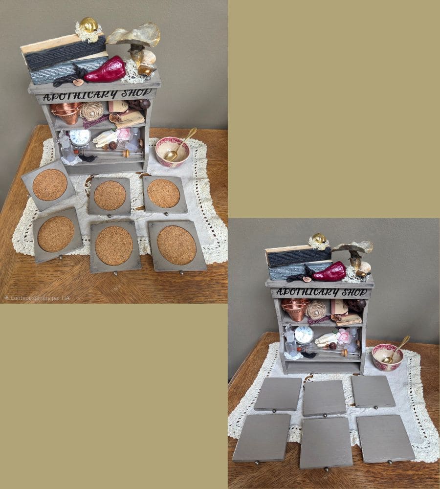 Superbe ancien support de dessous de verres, entièrement revalorisé dans un style cabinet de curiosités, à la croisée du vintage et de la déco campagne chic.