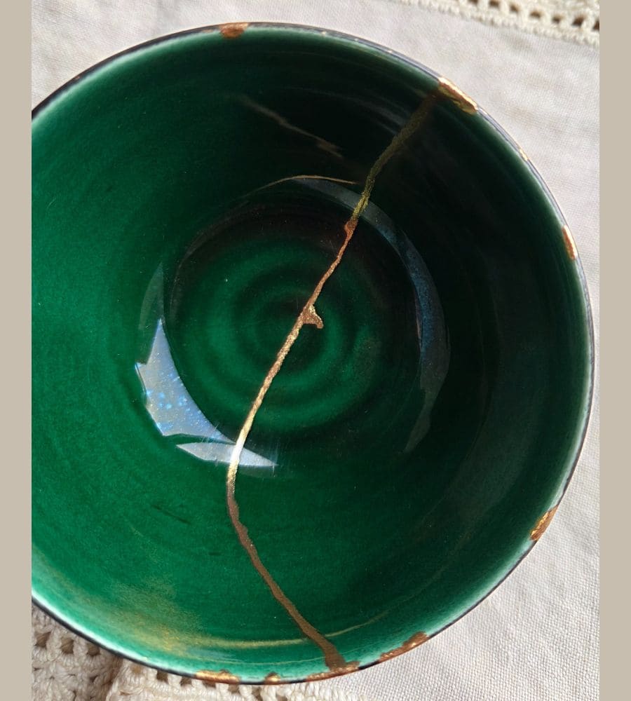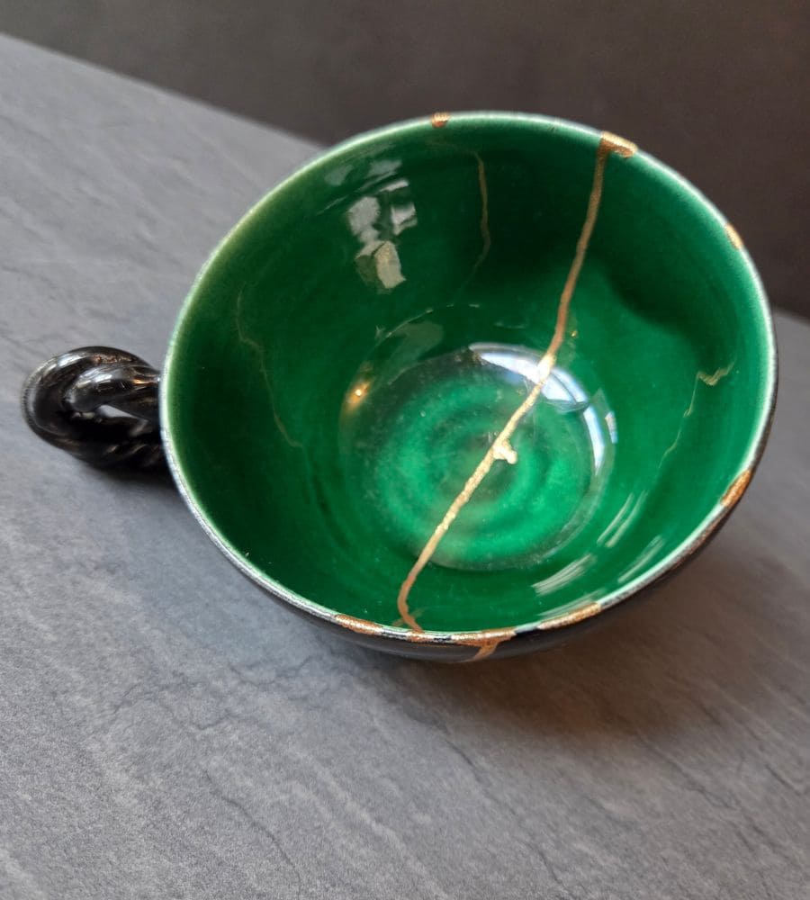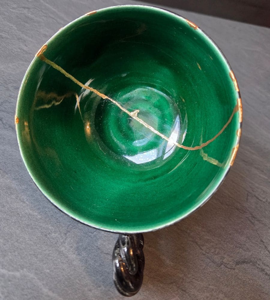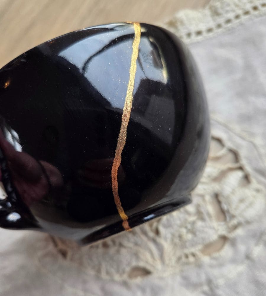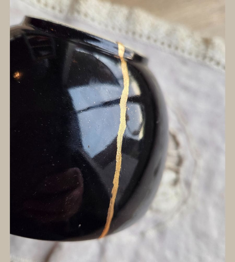 • Restauration kintsugi traditionnel (poudre d’aluminium, décoration uniquement)