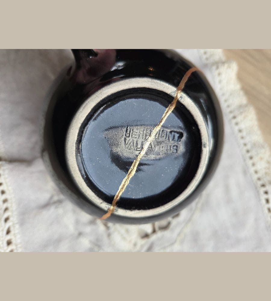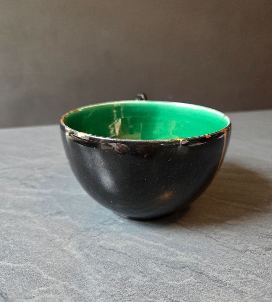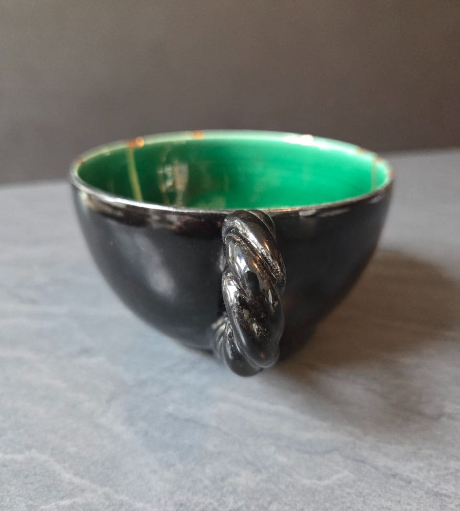Redécouvrez le charme vintage de ce déjeuner Vallauris en céramique, aux nuances profondes de noir et de vert. Cette pièce a été soigneusement restaurée selon la technique du kintsugi traditionnel, mettant en valeur ses lignes réparées avec une poudre d’aluminium dorée (non alimentaire).