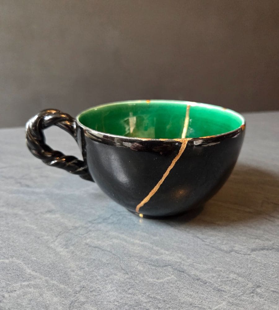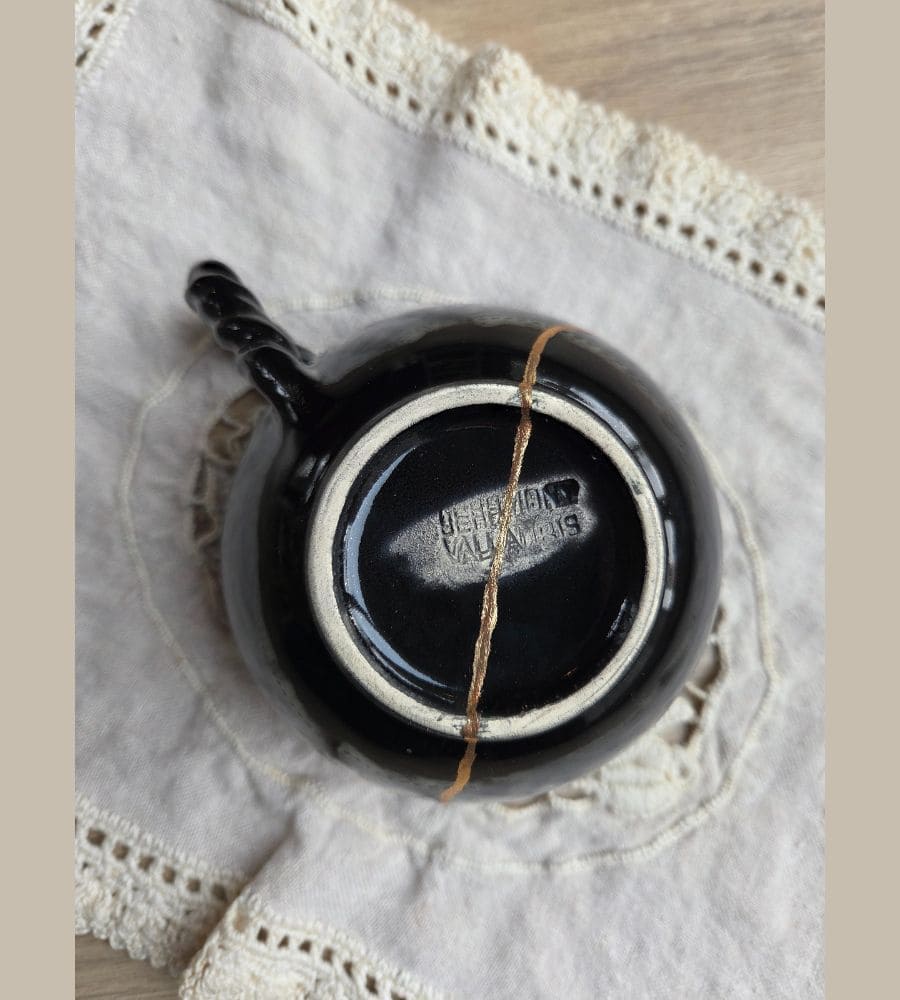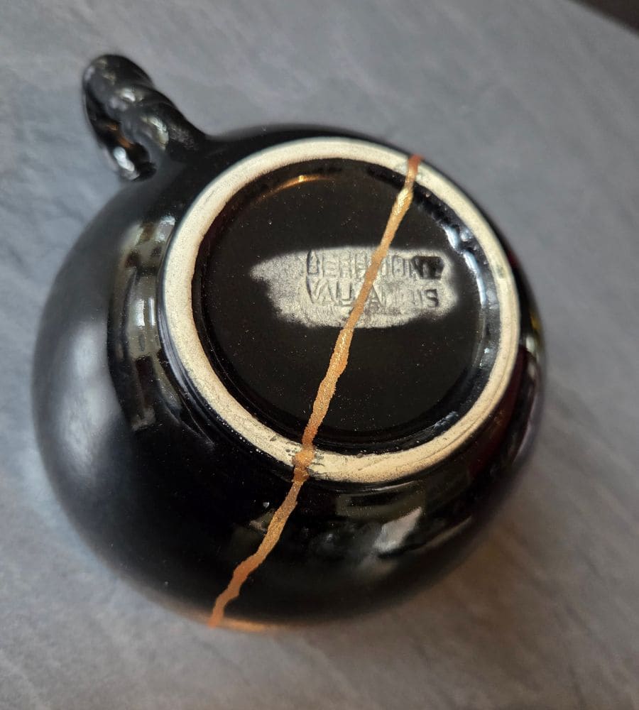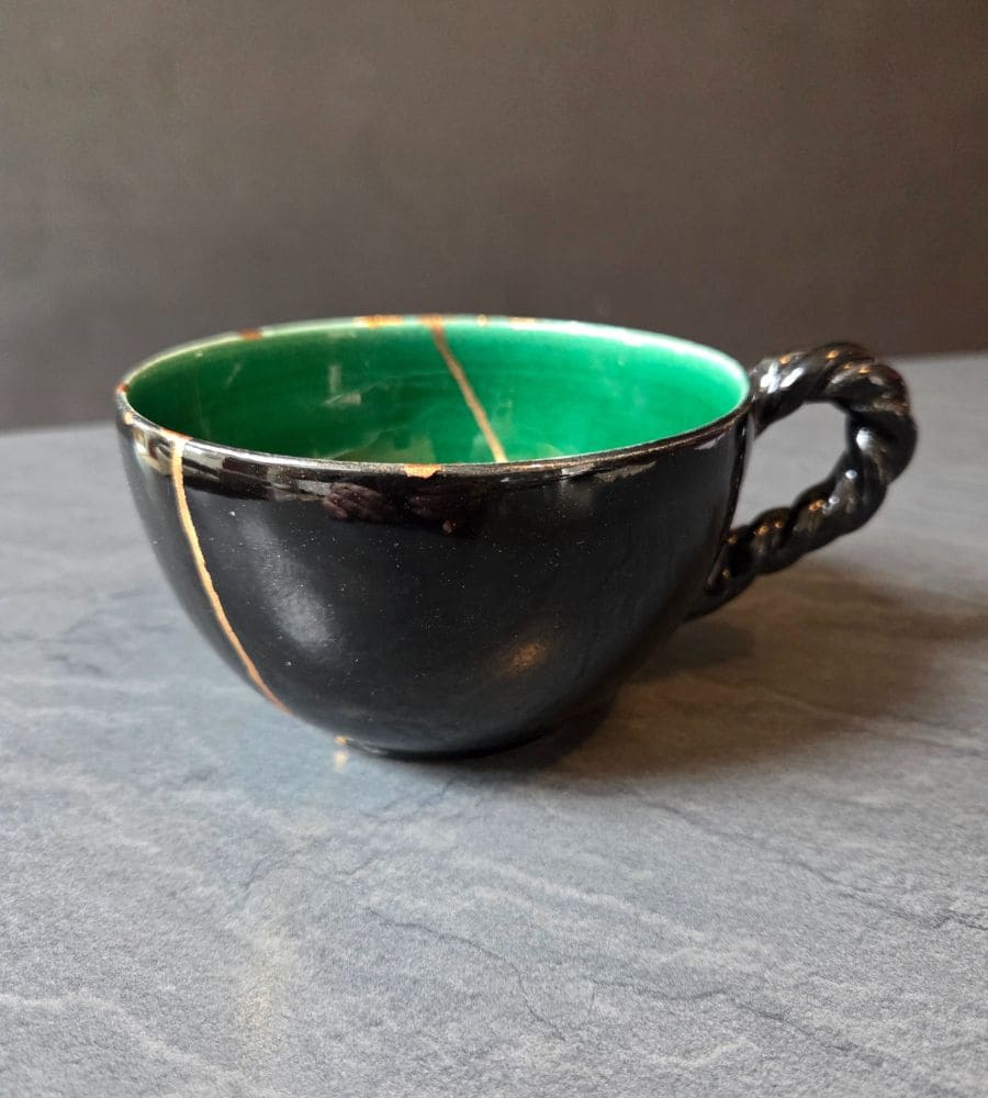 Redécouvrez le charme vintage de ce déjeuner Vallauris en céramique, aux nuances profondes de noir et de vert. Cette pièce a été soigneusement restaurée selon la technique du kintsugi traditionnel, mettant en valeur ses lignes réparées avec une poudre d’aluminium dorée (non alimentaire).
