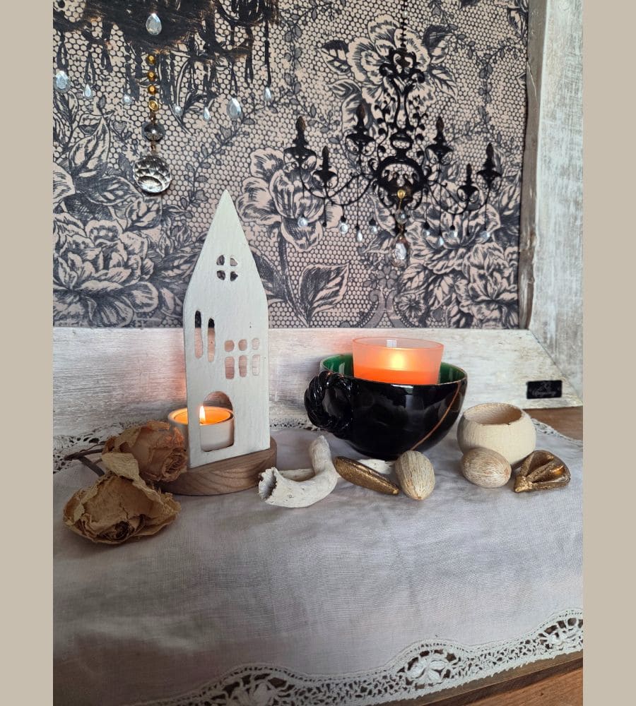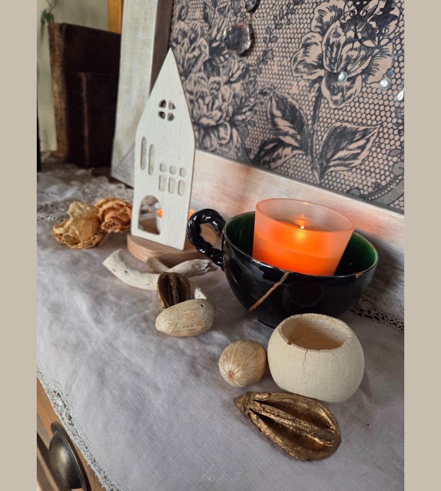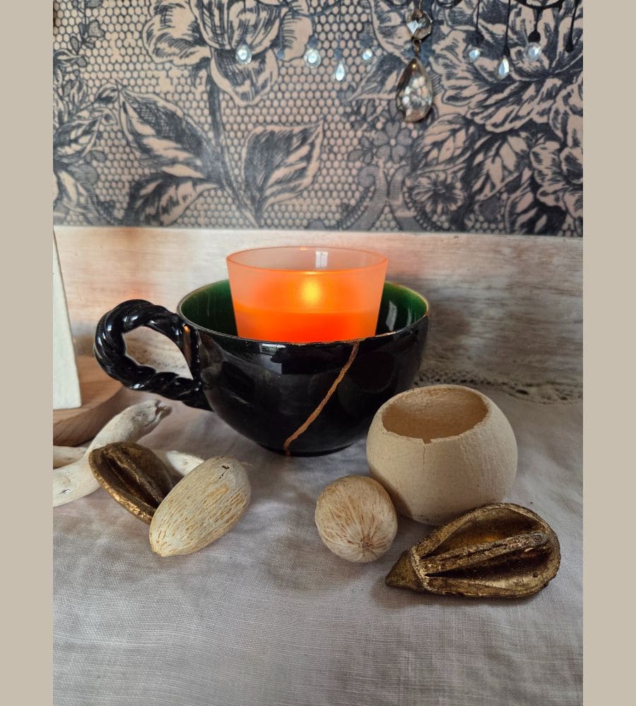 Ce set est accompagné d’une petite bougie verte (pas celle sur les photos qui a été allumée pour les prises de vue), parfaite pour créer une ambiance douce et chaleureuse autour de la pièce.