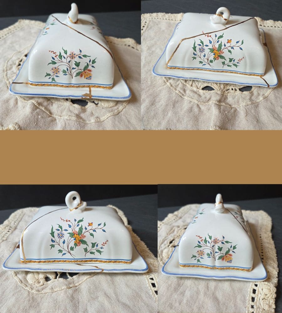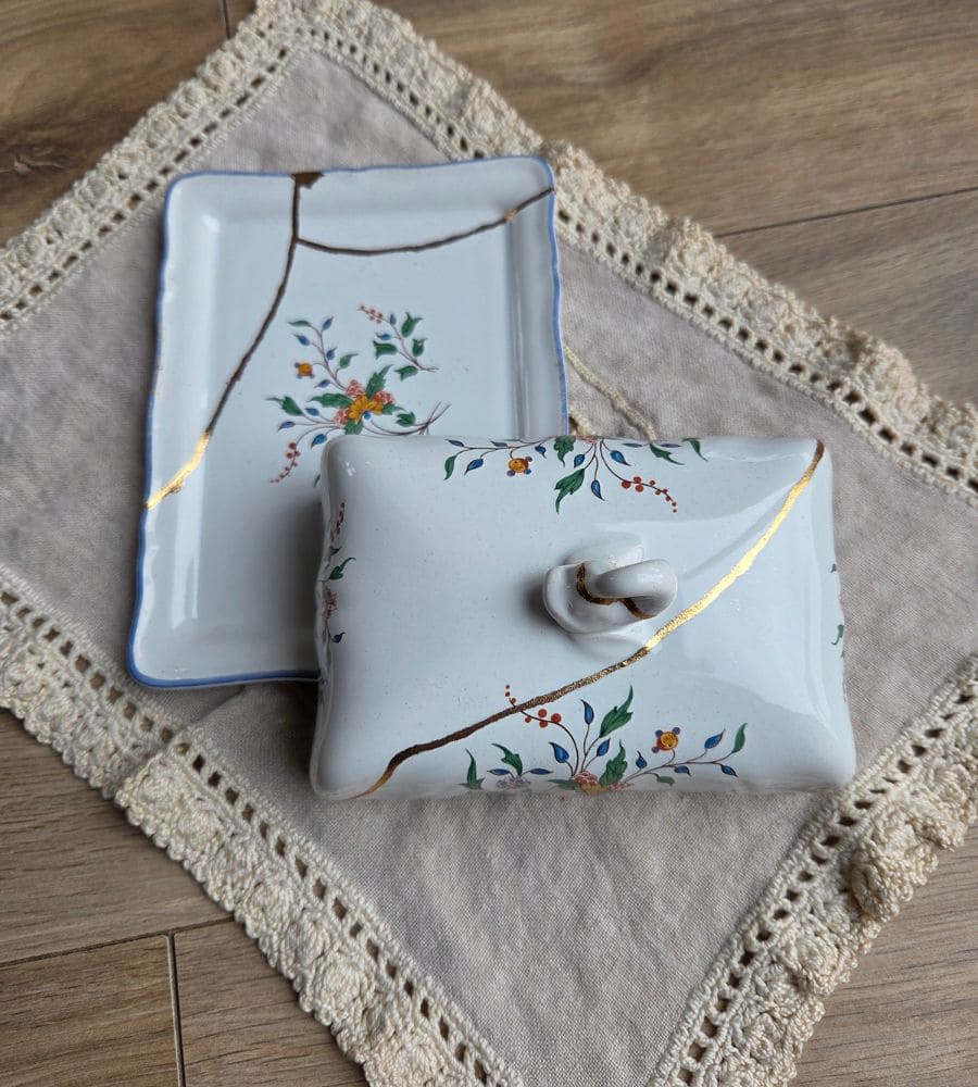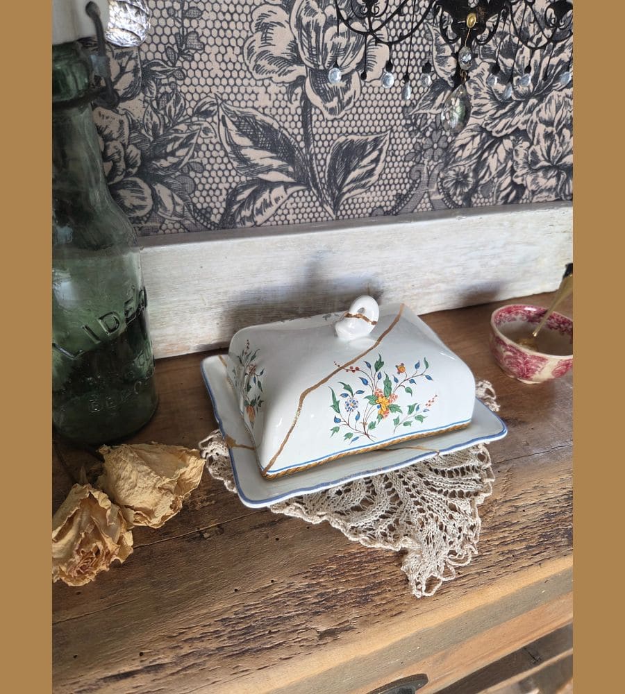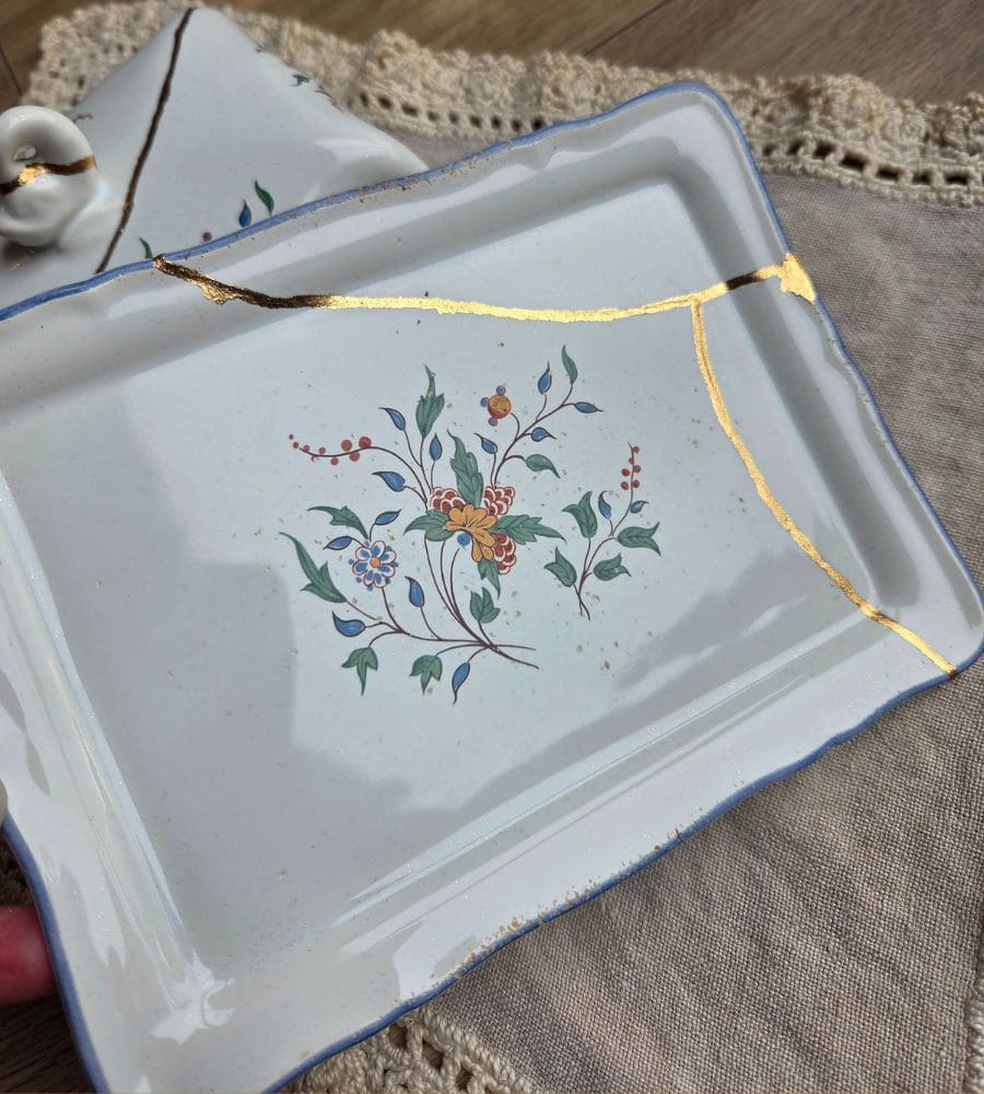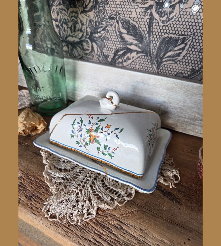 Un beurrier en faïence Gien – Kintsugi