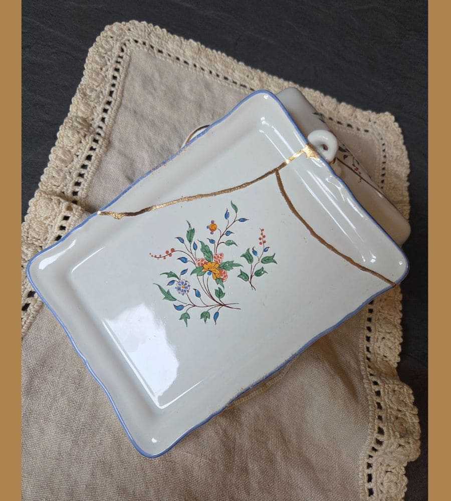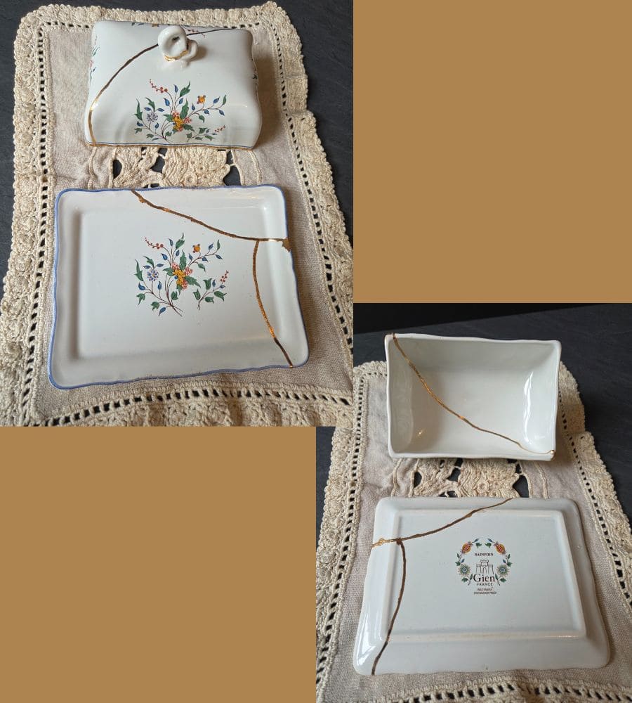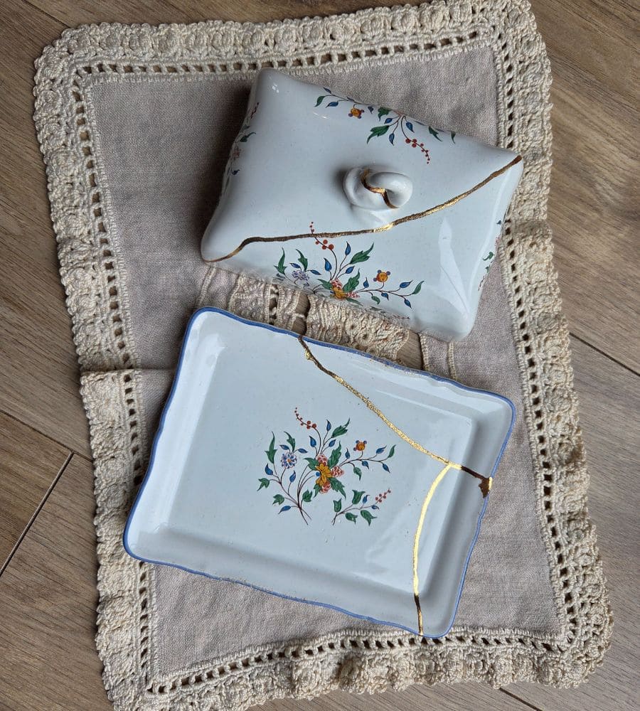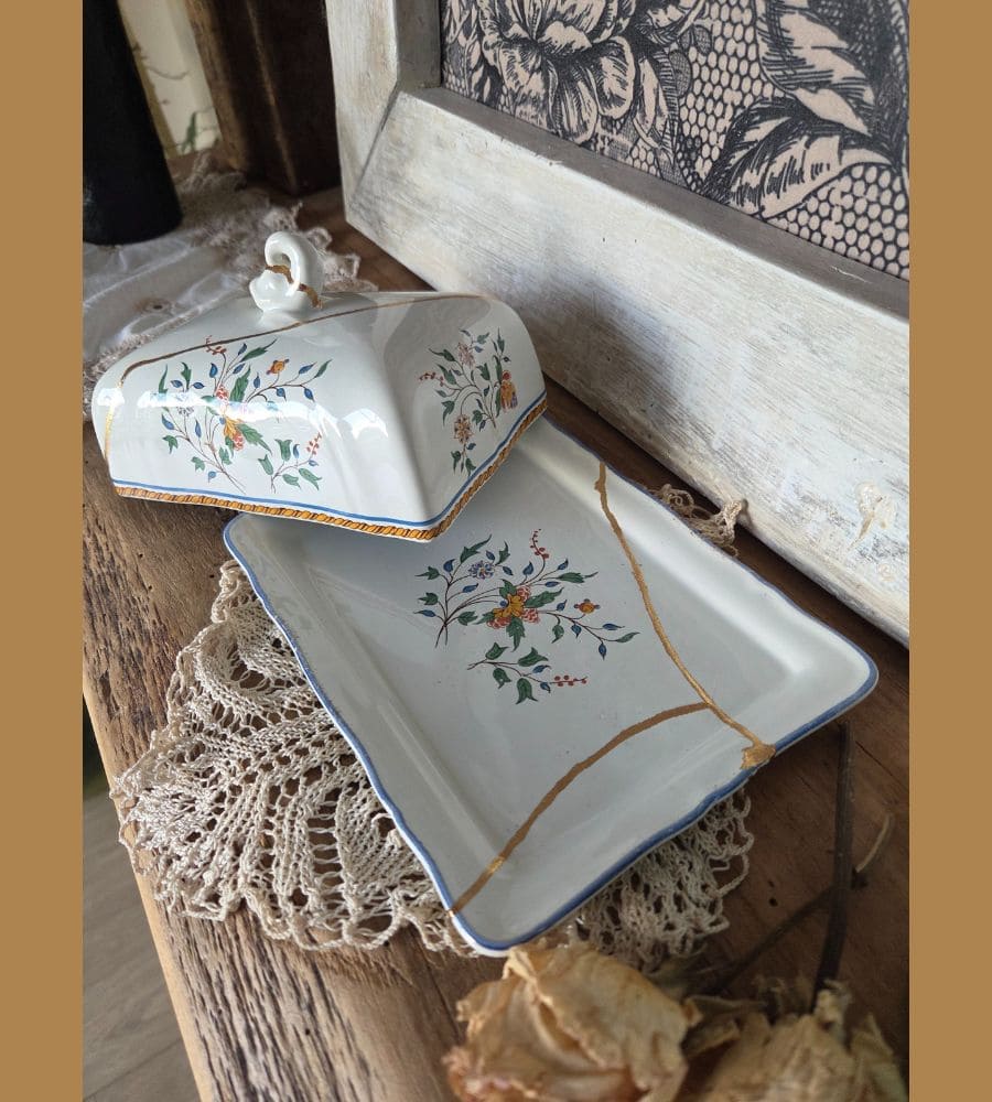Un beurrier en faïence Gien – Kintsugi