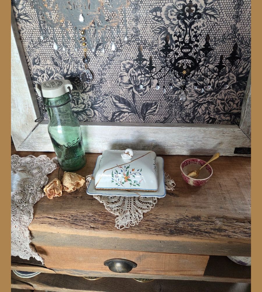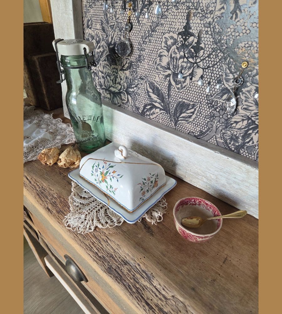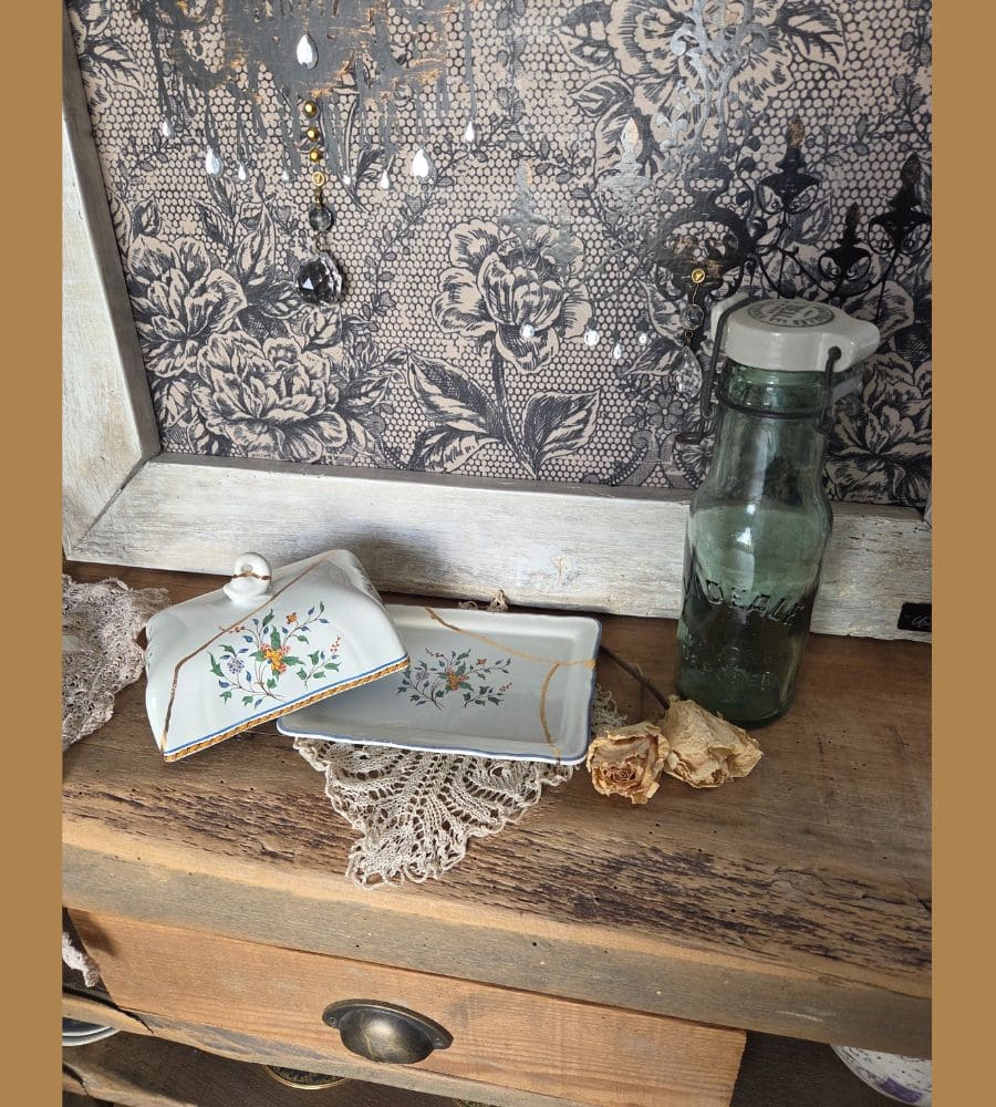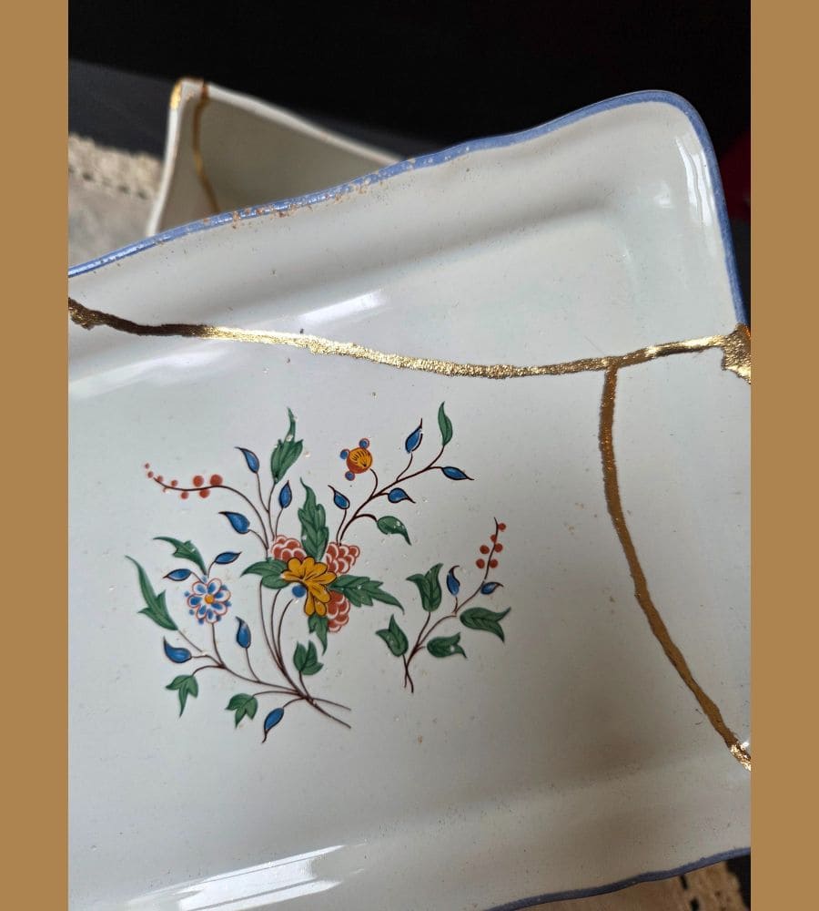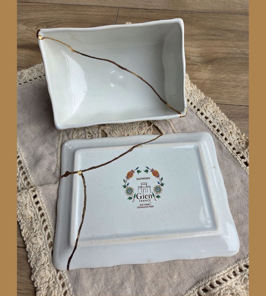 Un beurrier en faïence Gien – Kintsugi
