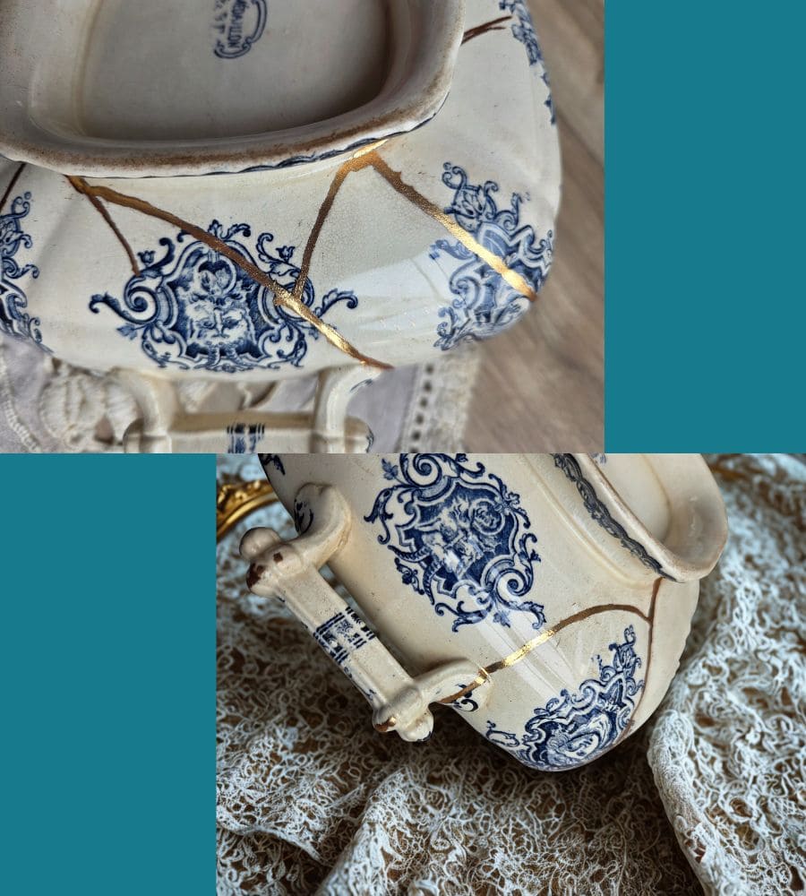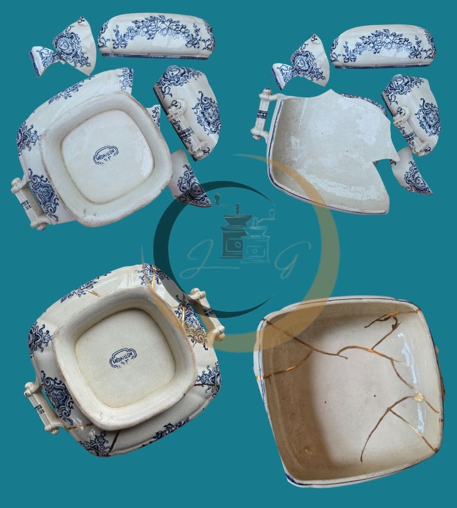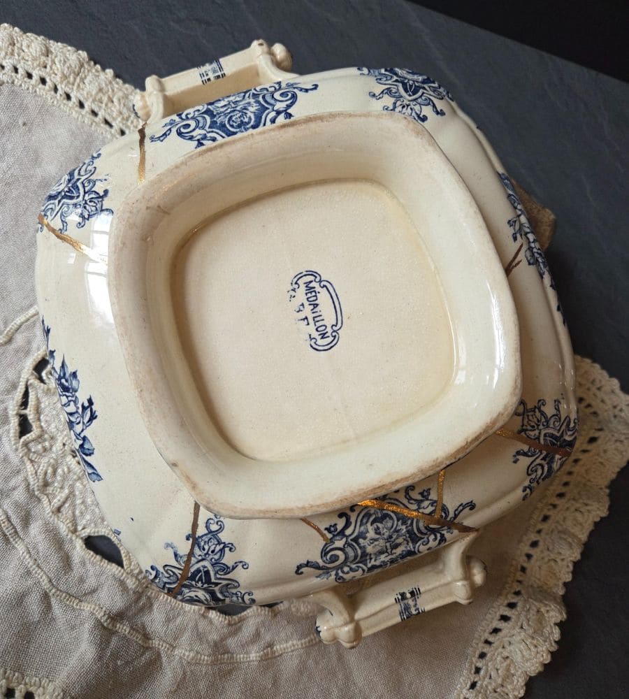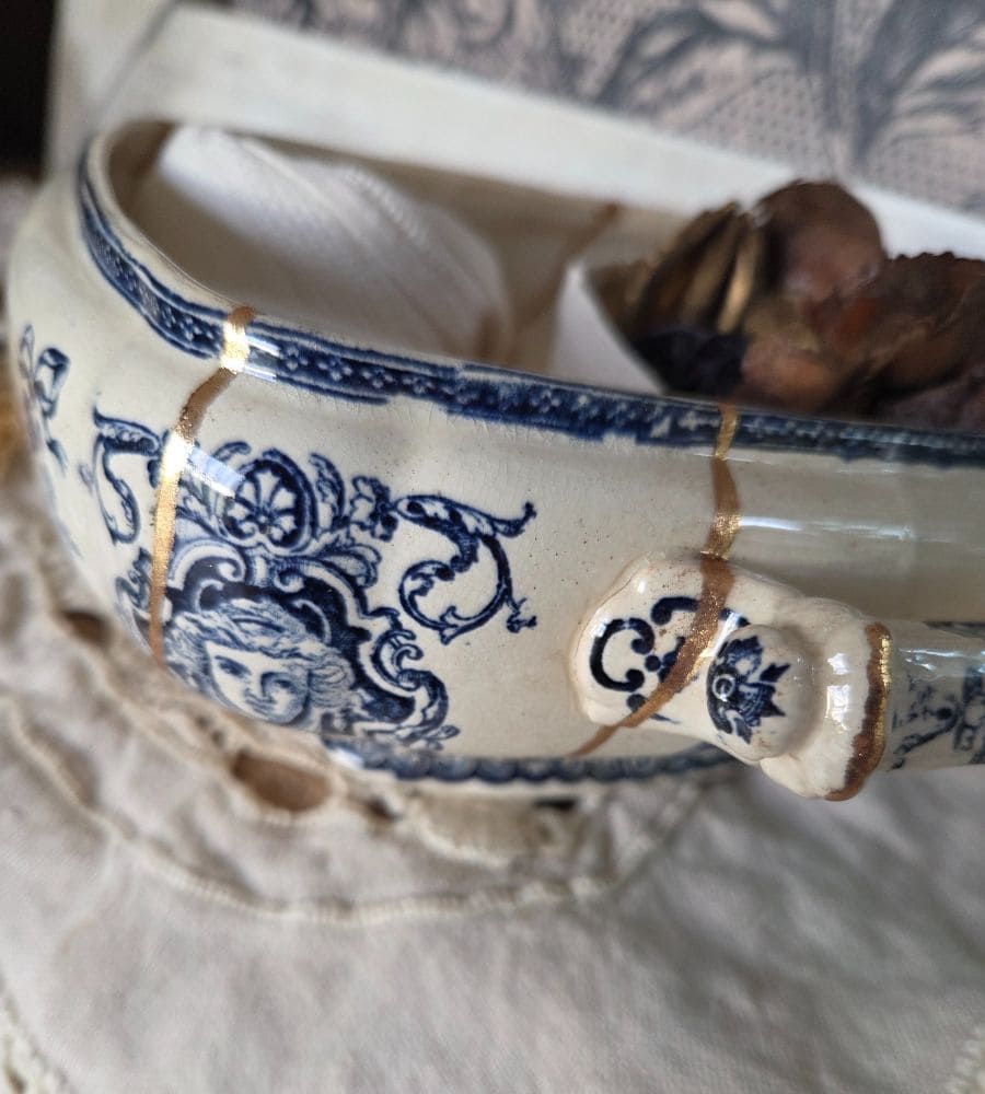 • Soupière restaurée en kintsugi traditionnel (poudre d’aluminium doré)