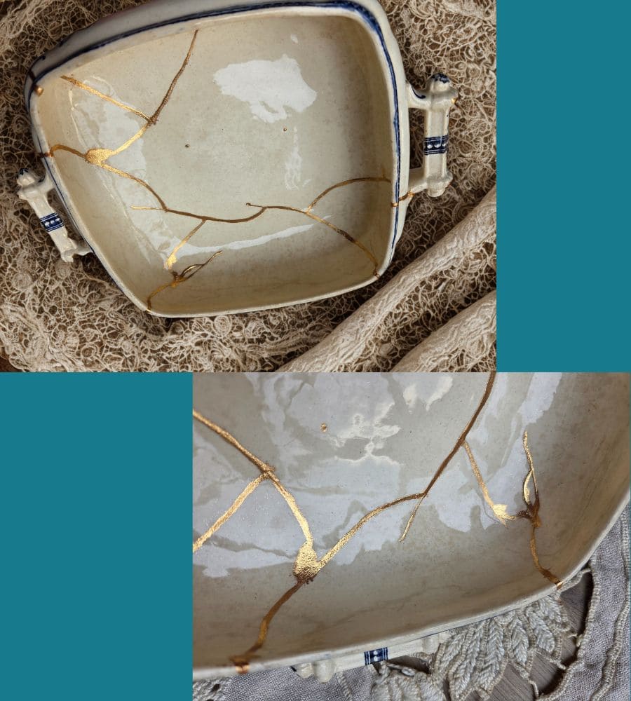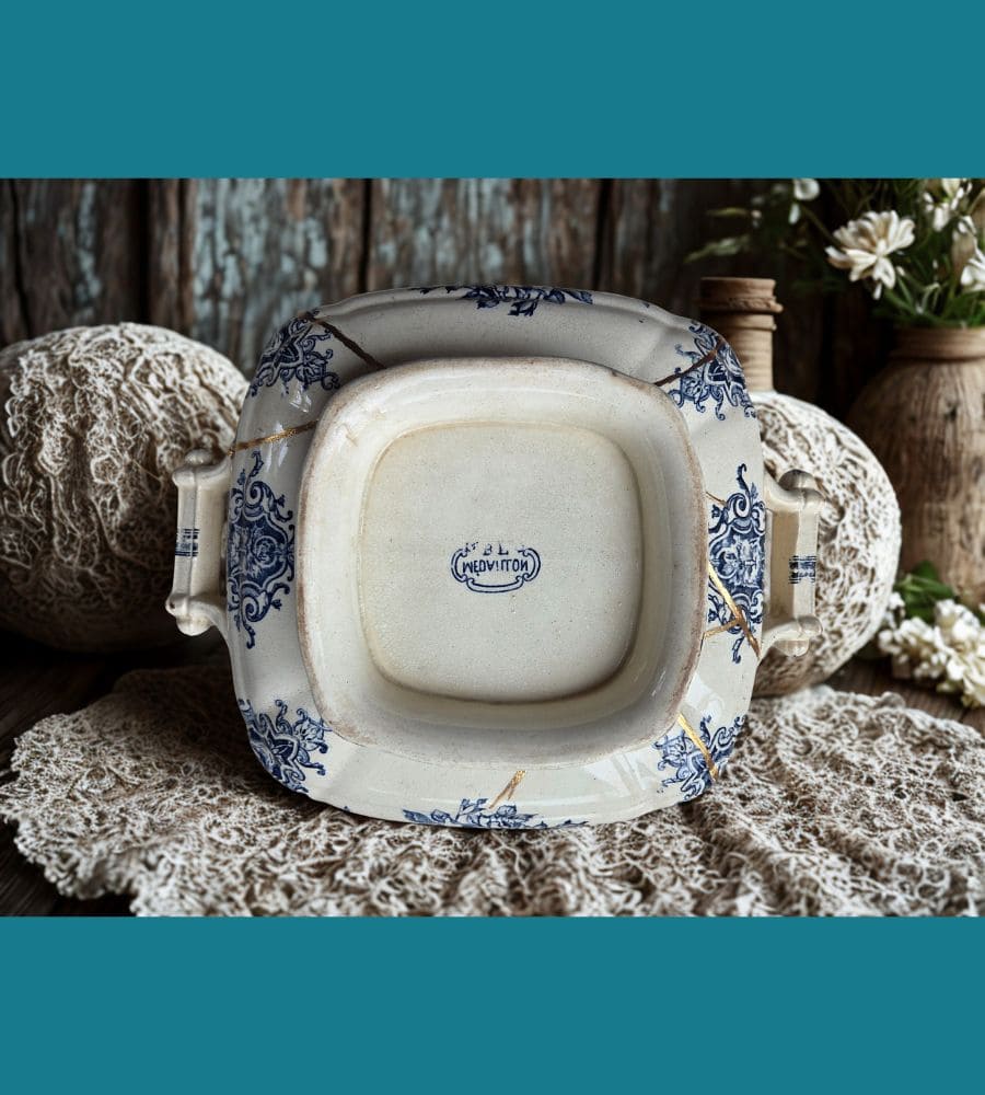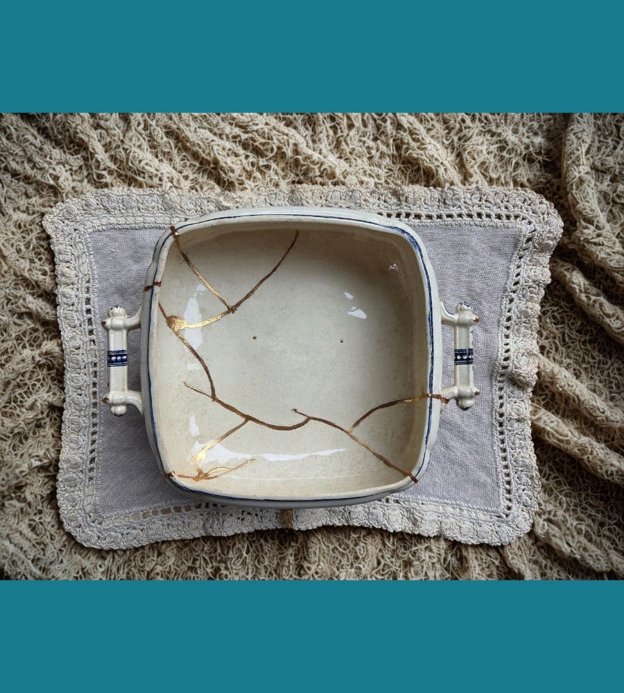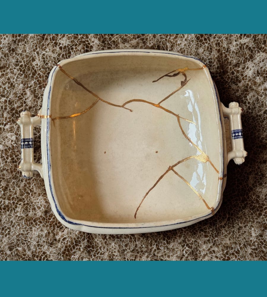 • Soupière restaurée en kintsugi traditionnel (poudre d’aluminium doré)