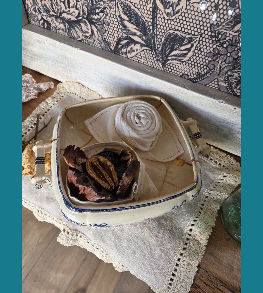 Il est vendu avec un petit pochon en lin “pot-pourri” et une serviette ancienne pliée en rose.