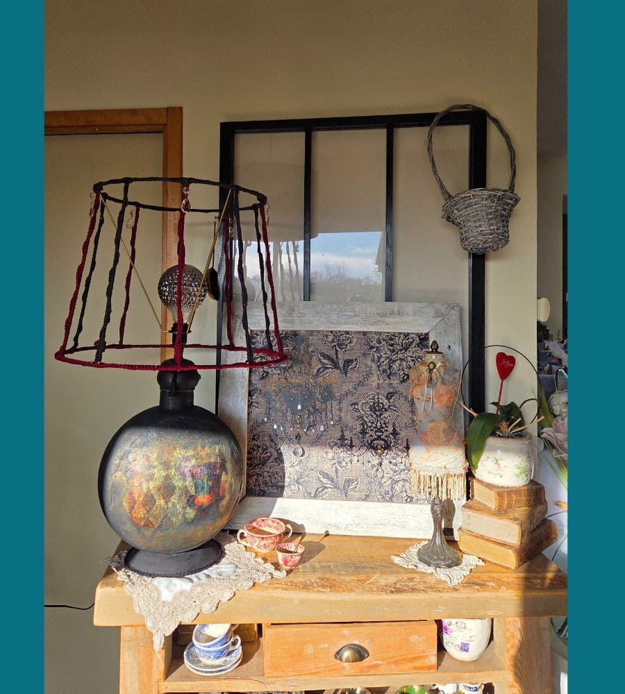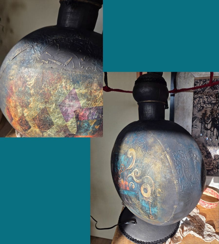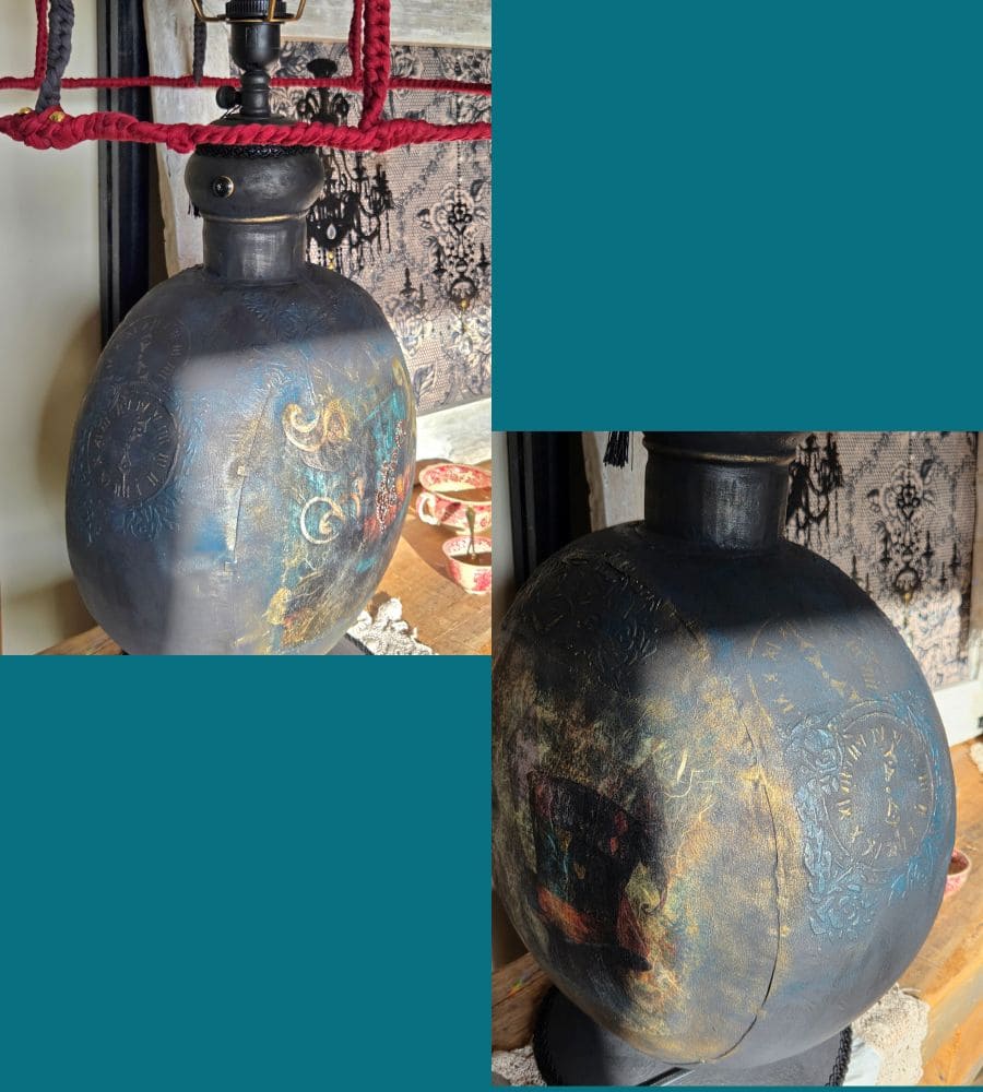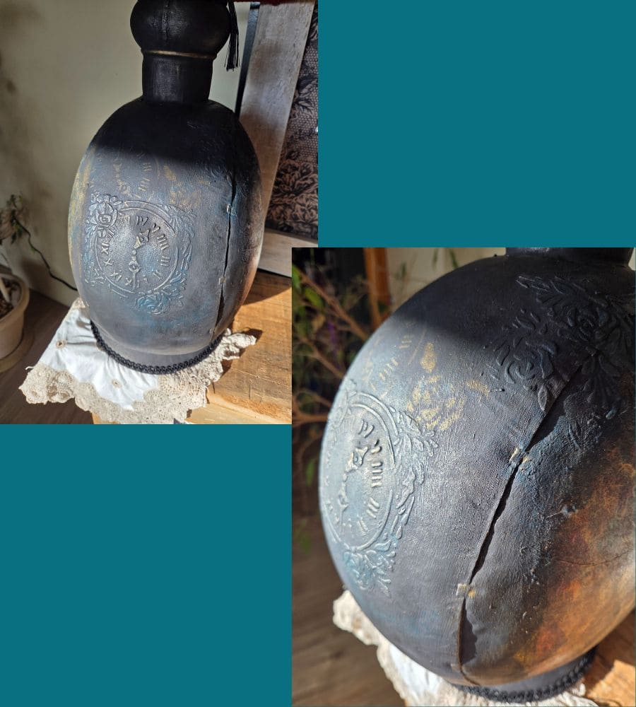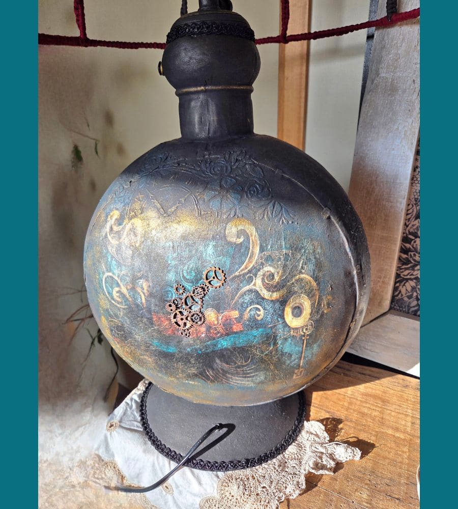 Entièrement réalisée à la main, cette lampe upcyclée est une pièce unique. La finition repose sur une patine volontaire et maîtrisée : peinture à la craie « Black Athenian » avec touches bleutées, patine à la cire « noir graphite », rehauts de cire dorée, reliefs et pochoirs aux motifs de pendules et de fleurs. L’ensemble est enrichi de papier mûrier assorti, d’anciennes pampilles en verre, d’ornements en forme d’engrenages et d’un galon noir, renforçant l’identité steampunk et poétique de l’objet.