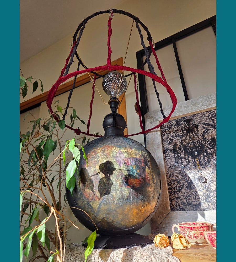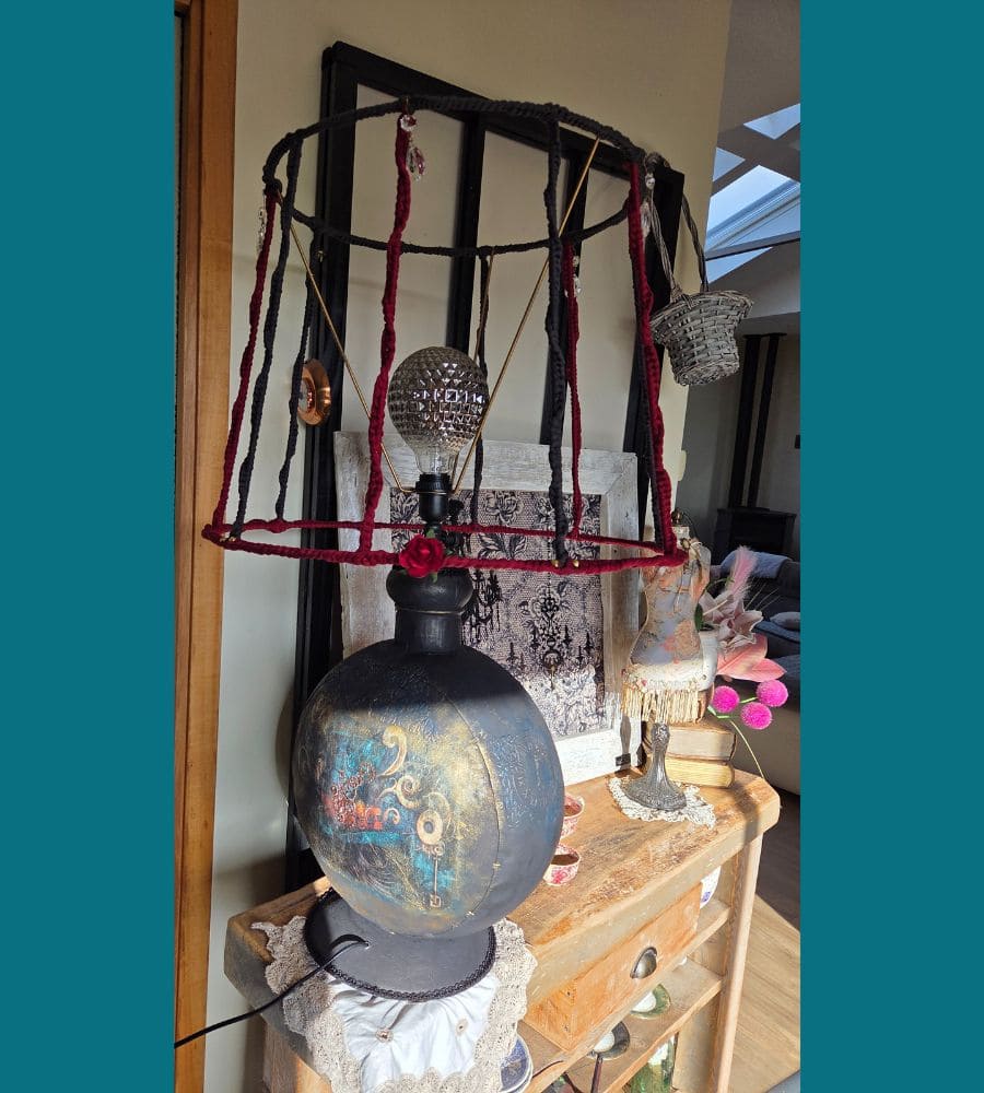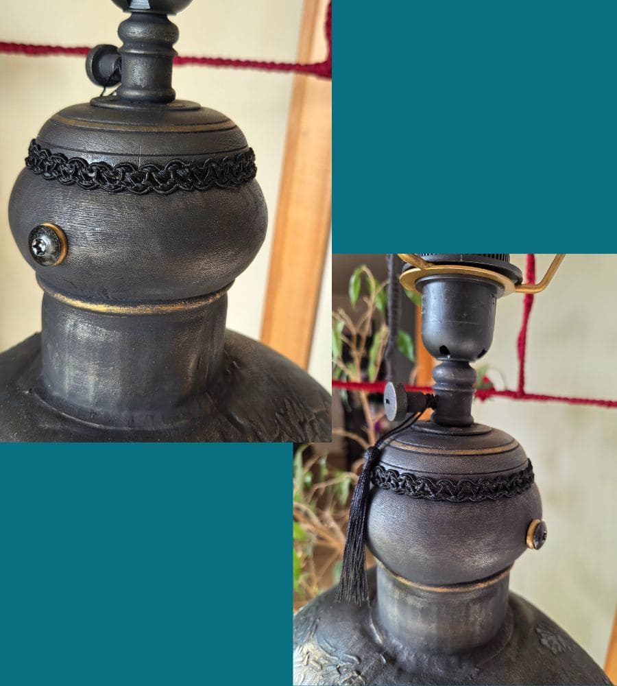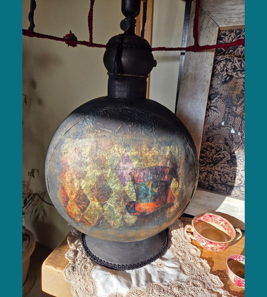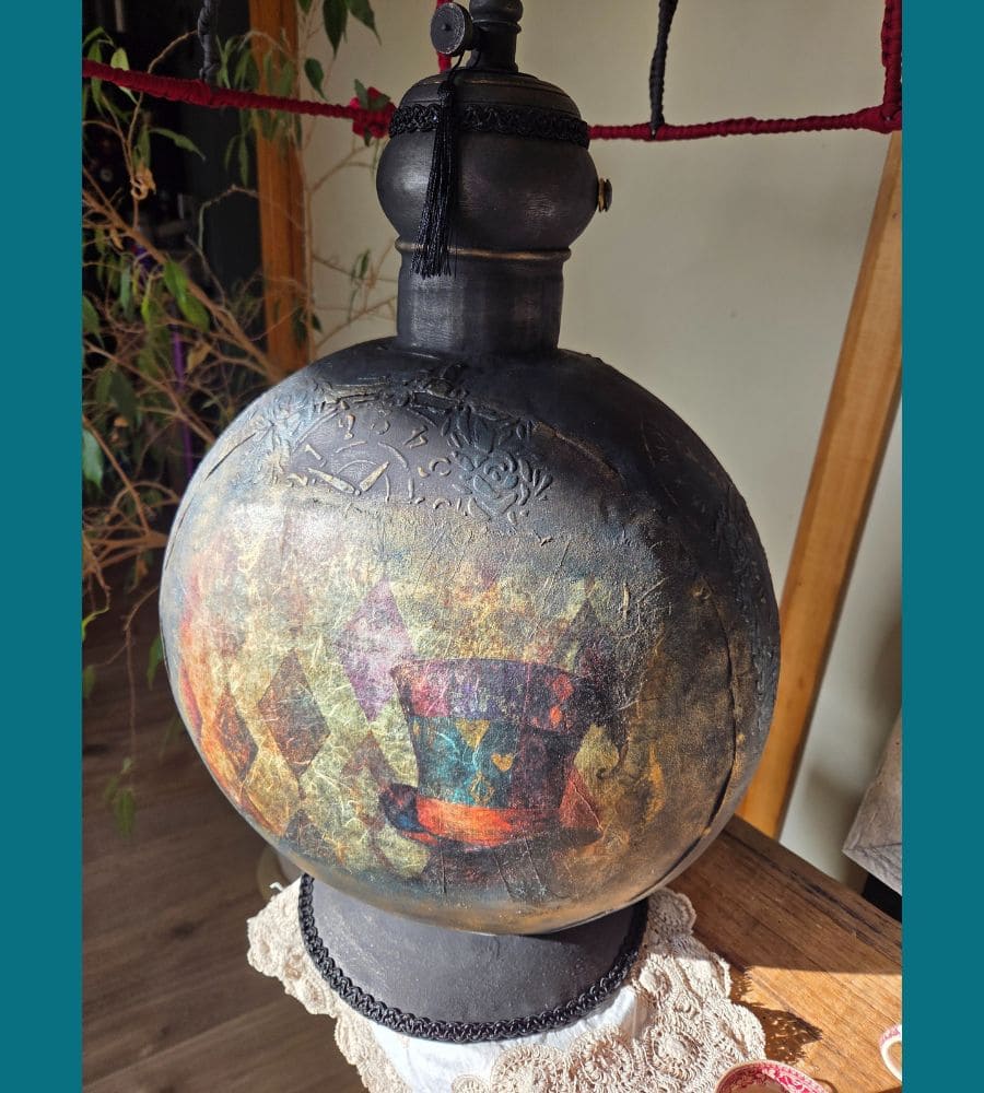 Entièrement réalisée à la main, cette lampe upcyclée est une pièce unique. La finition repose sur une patine volontaire et maîtrisée : peinture à la craie « Black Athenian » avec touches bleutées, patine à la cire « noir graphite », rehauts de cire dorée, reliefs et pochoirs aux motifs de pendules et de fleurs. L’ensemble est enrichi de papier mûrier assorti, d’anciennes pampilles en verre, d’ornements en forme d’engrenages et d’un galon noir, renforçant l’identité steampunk et poétique de l’objet.