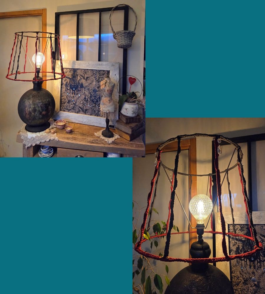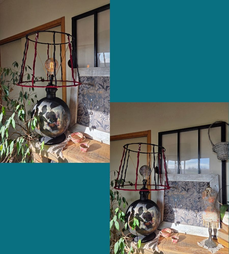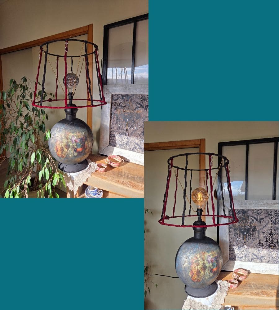 Cette lampe artisanale upcyclée est bien plus qu’un luminaire : c’est une œuvre décorative forte, pensée pour devenir une pièce centrale de l’espace.