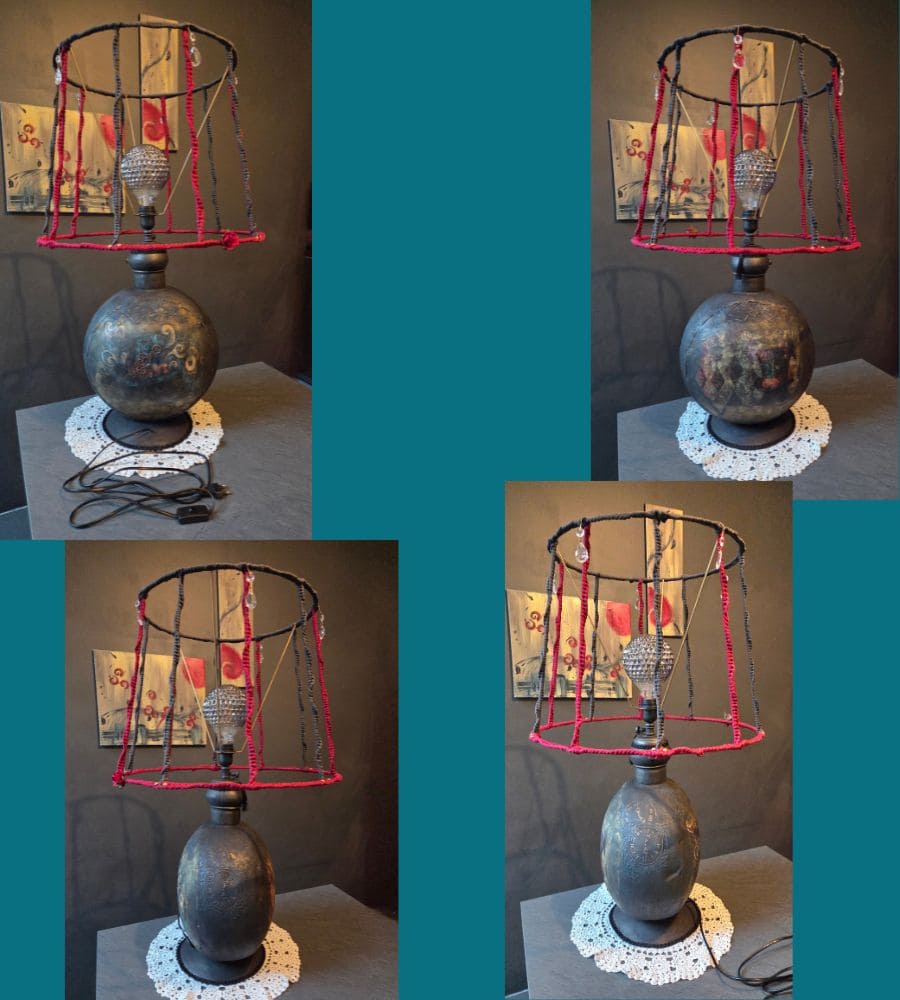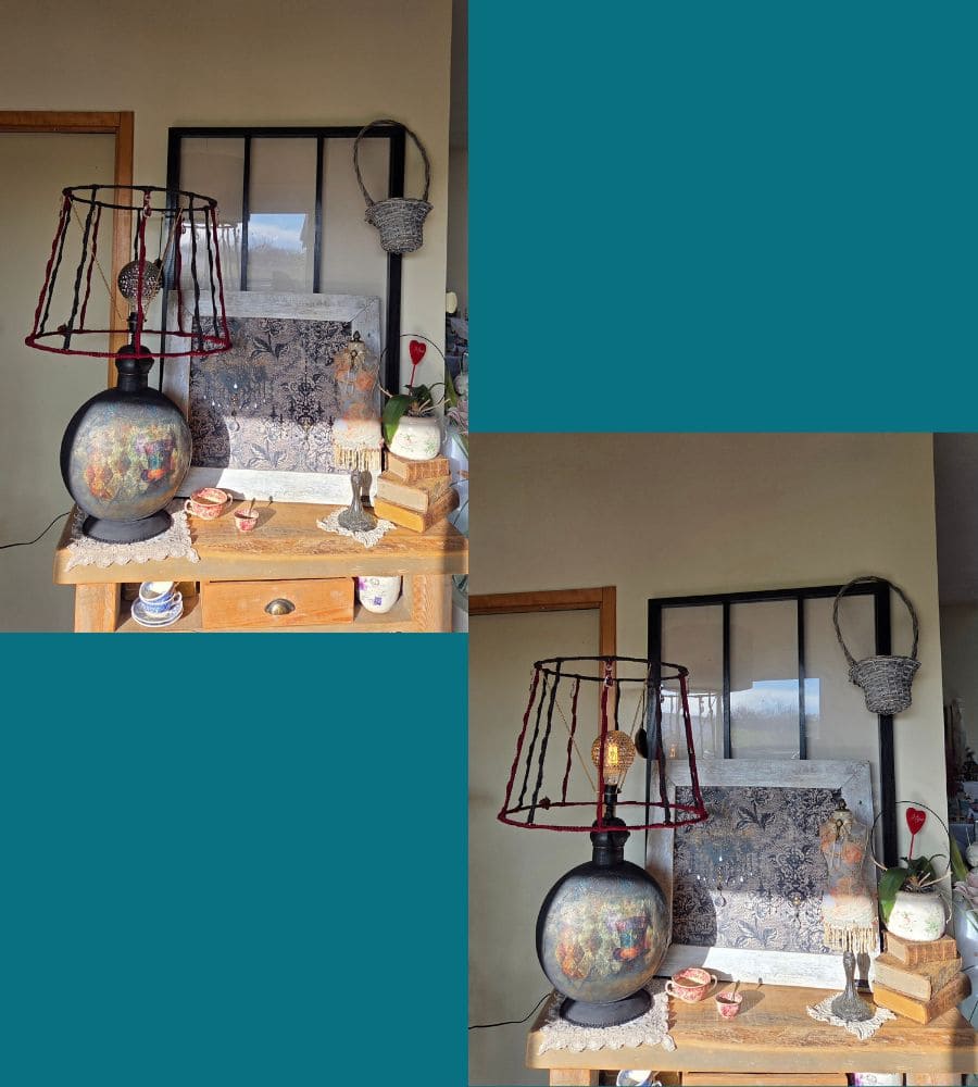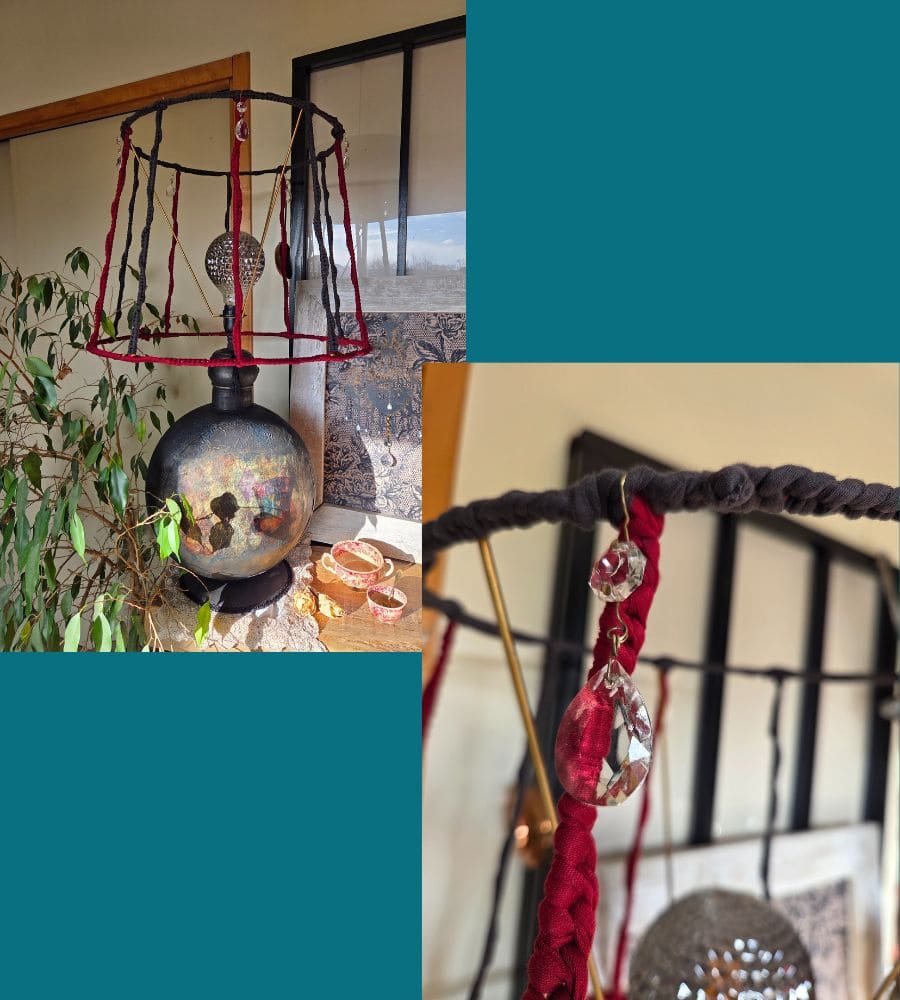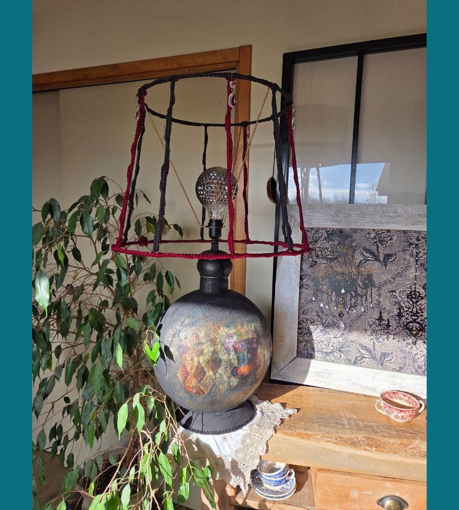 Cette lampe artisanale upcyclée est bien plus qu’un luminaire : c’est une œuvre décorative forte, pensée pour devenir une pièce centrale de l’espace.