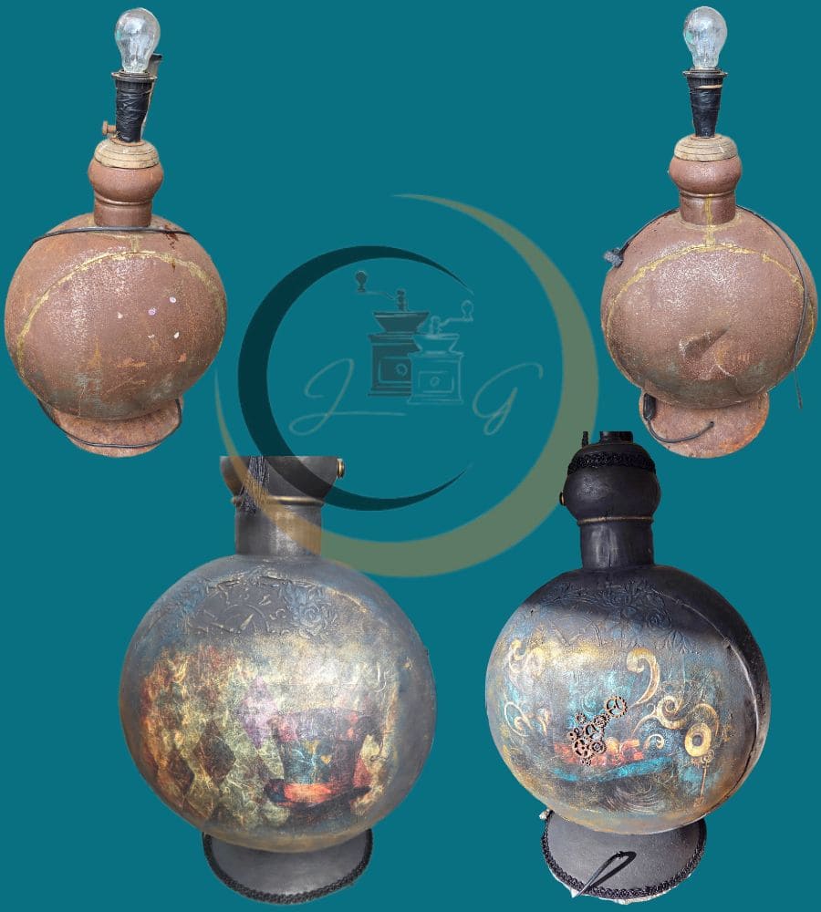 Lampe artisanale revalorisée en création unique, inspirée de l’univers steampunk et de « Alice au Pays des Merveilles », plus précisément du personnage emblématique du « Chapelier fou ». Cette pièce de caractère assume pleinement son aspect ancien : creux, cabosses et traces du temps participent à son esthétique et à son charme singulier.