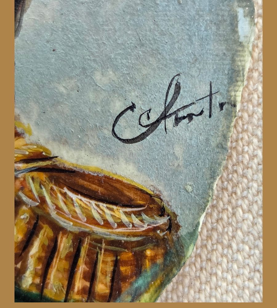 De la feuille dorée champagne a été appliquée sur une partie de la peinture (sur ivoire? … voir transparence sur les photo), qui était abîmée (coulures d’eau?).