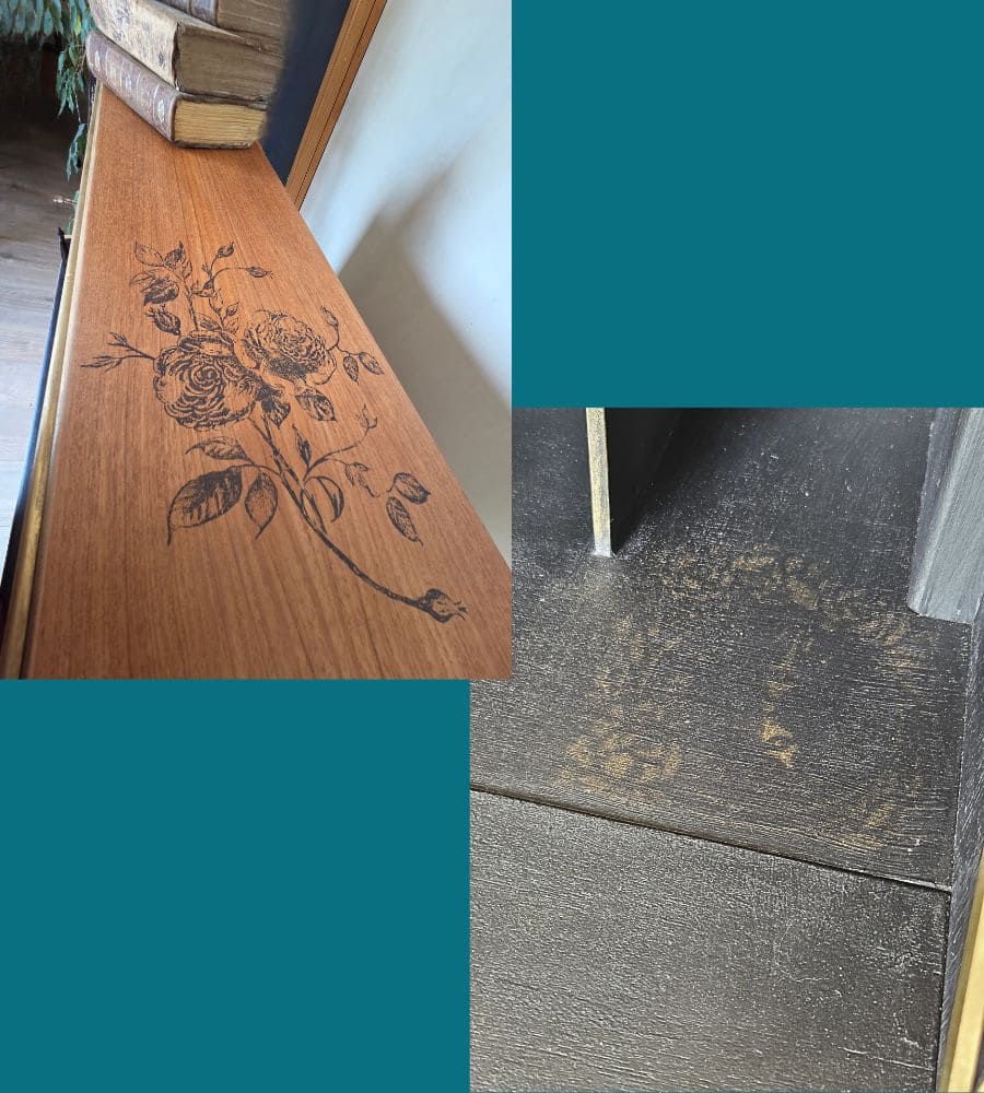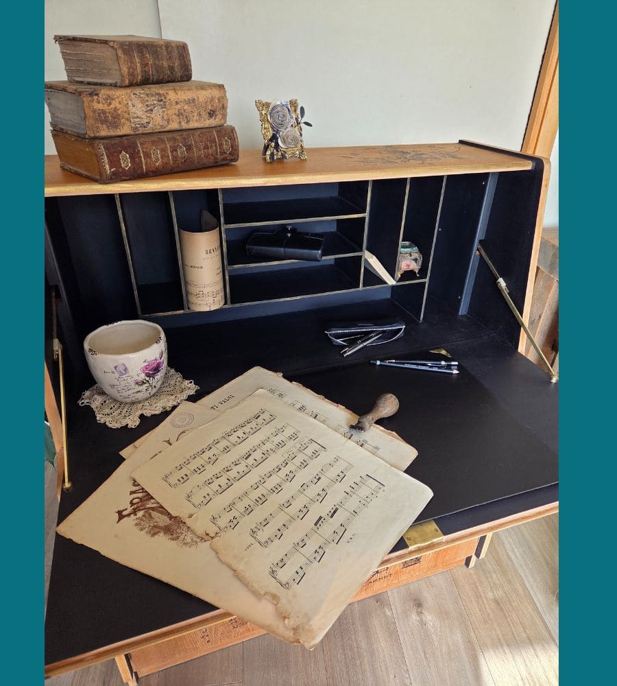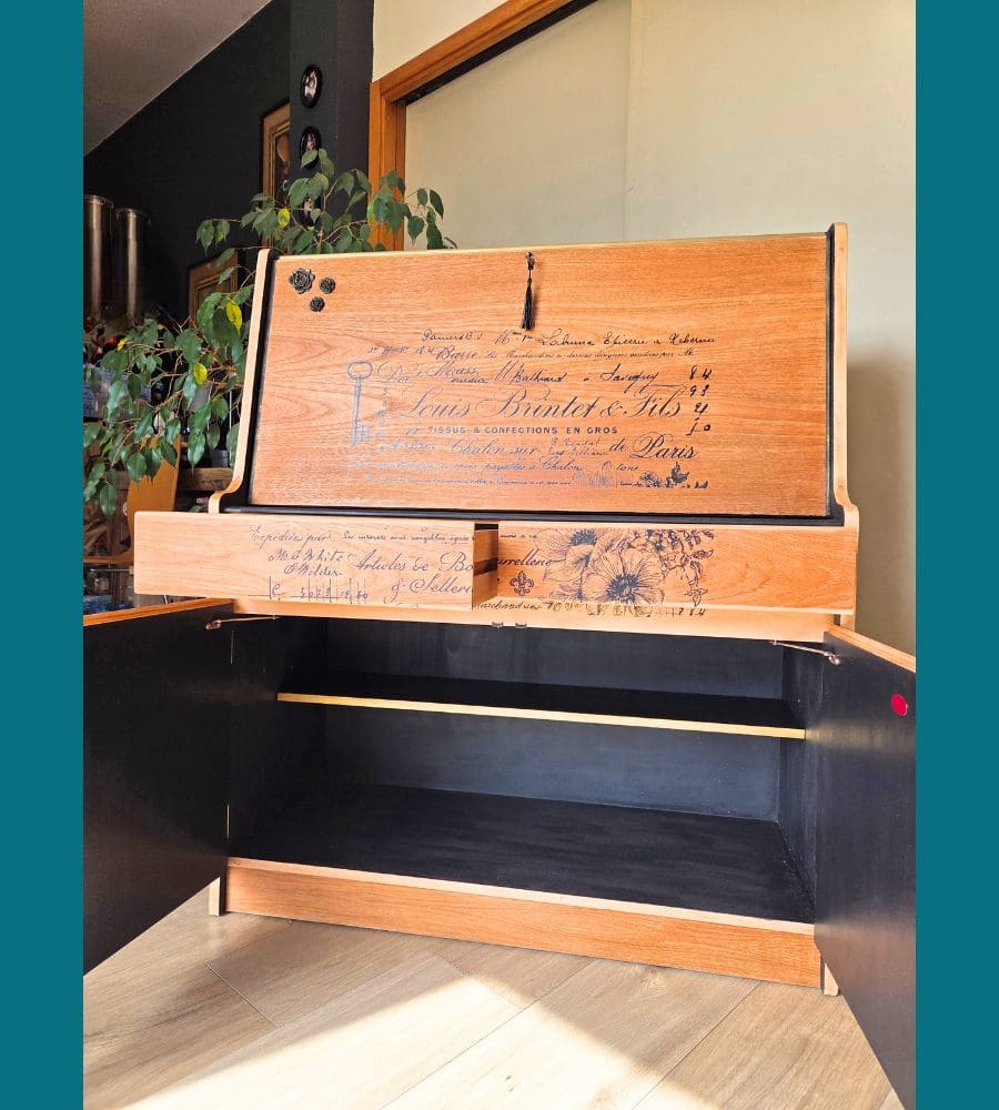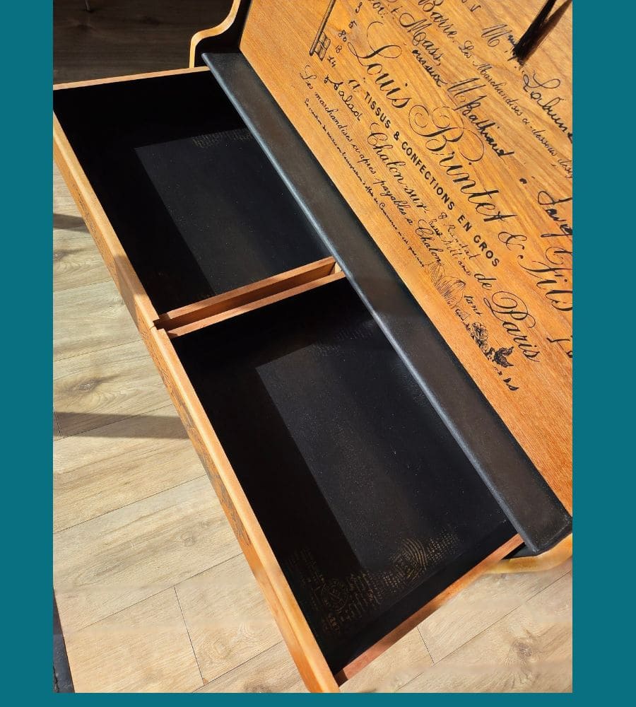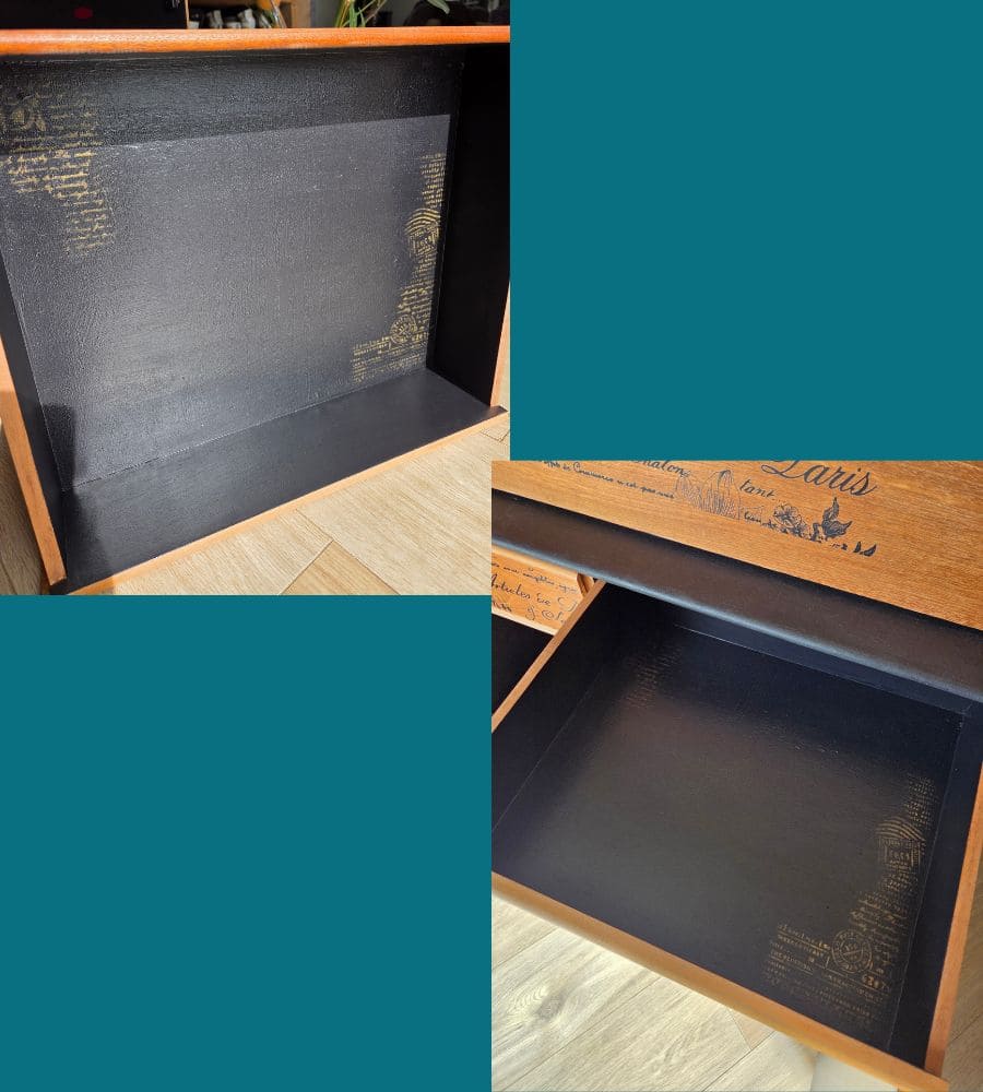 L’intérieur est peint avec une peinture a la craie « black athenian » pour lui donner un effet texturé et patiné, et légèrement doré.