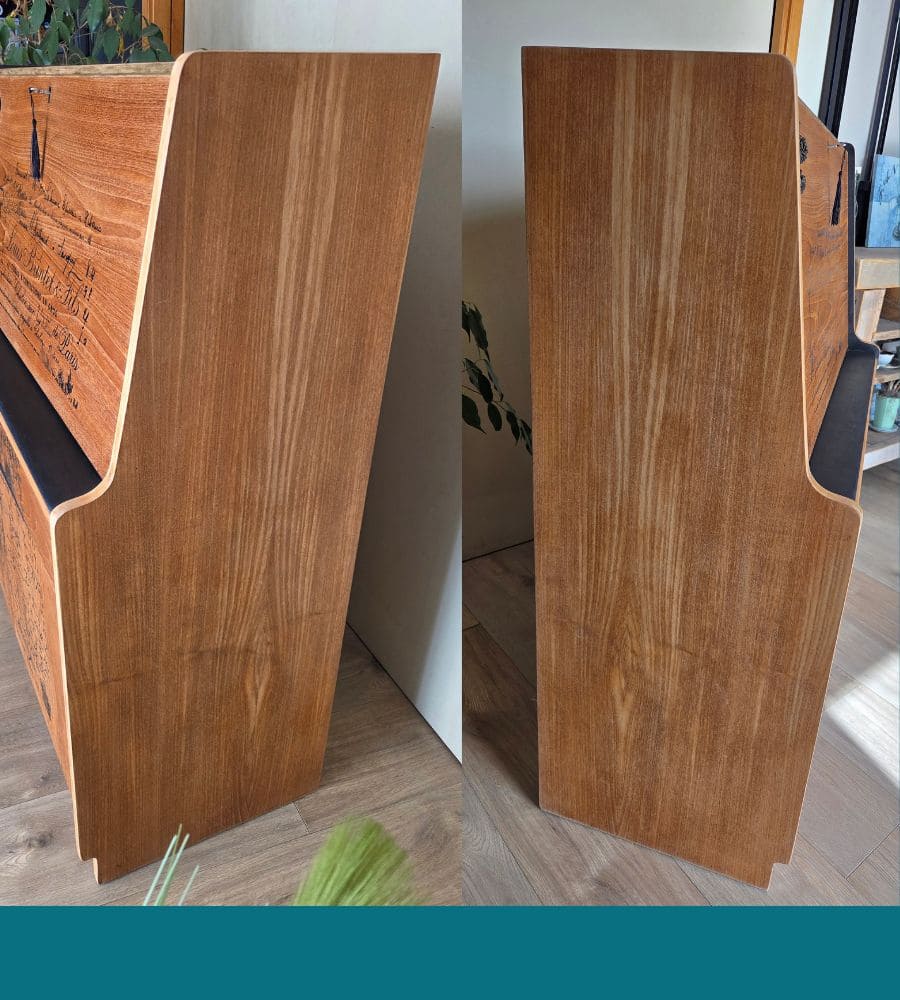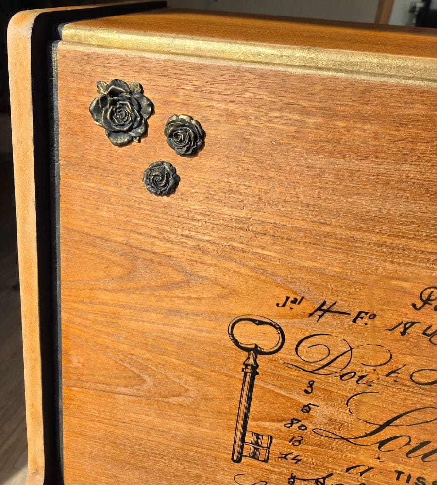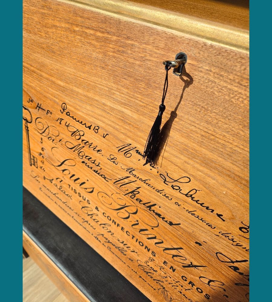 Une cire incolore de finition a été appliquée sur l’ensemble du meuble pour retrouver sa jolie couleur miel et garder son esprit vintage.