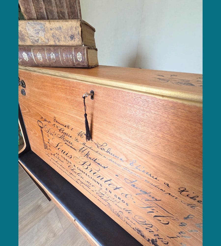 Le sous-main d’origine a été recouvert d’un similicuir épais doublé pour ajouter du cachet.