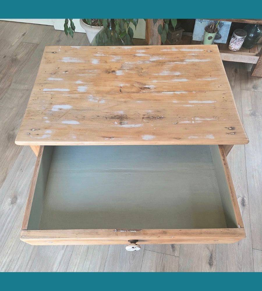 Le tiroir, qui coulisse parfaitement, est peint à la peinture à la craie « coolabah green », et un bouton en céramique esprit campagne a été ajouté.