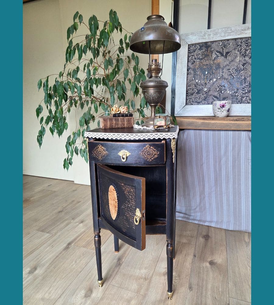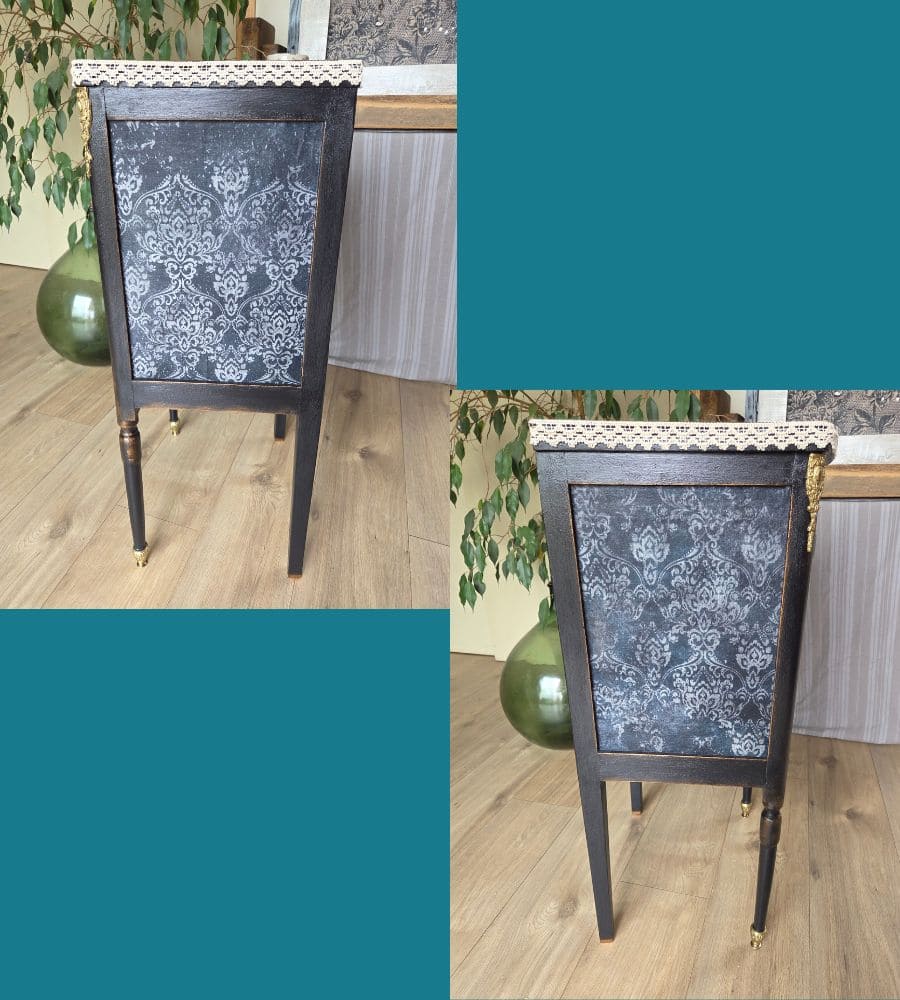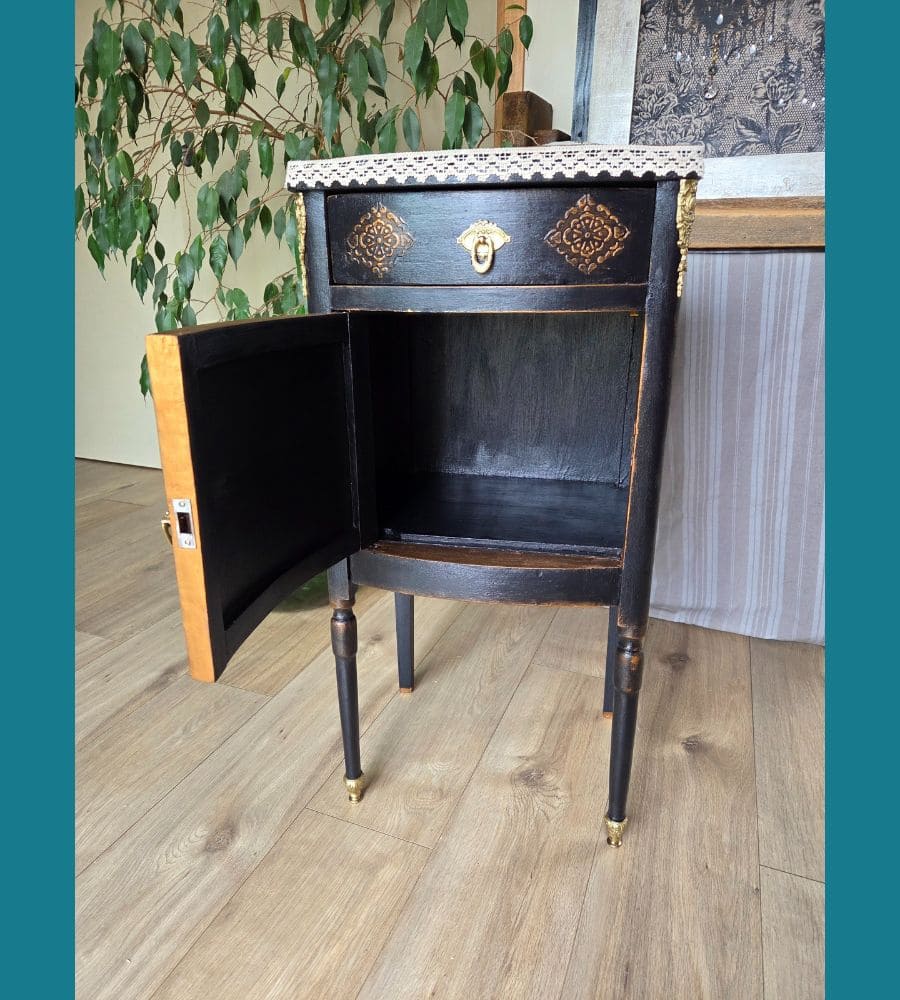 Cette magnifique table de chevet au style baroque, rococo, victorien, pourra également être utilisée comme petit meuble d’entrée ou de salon.