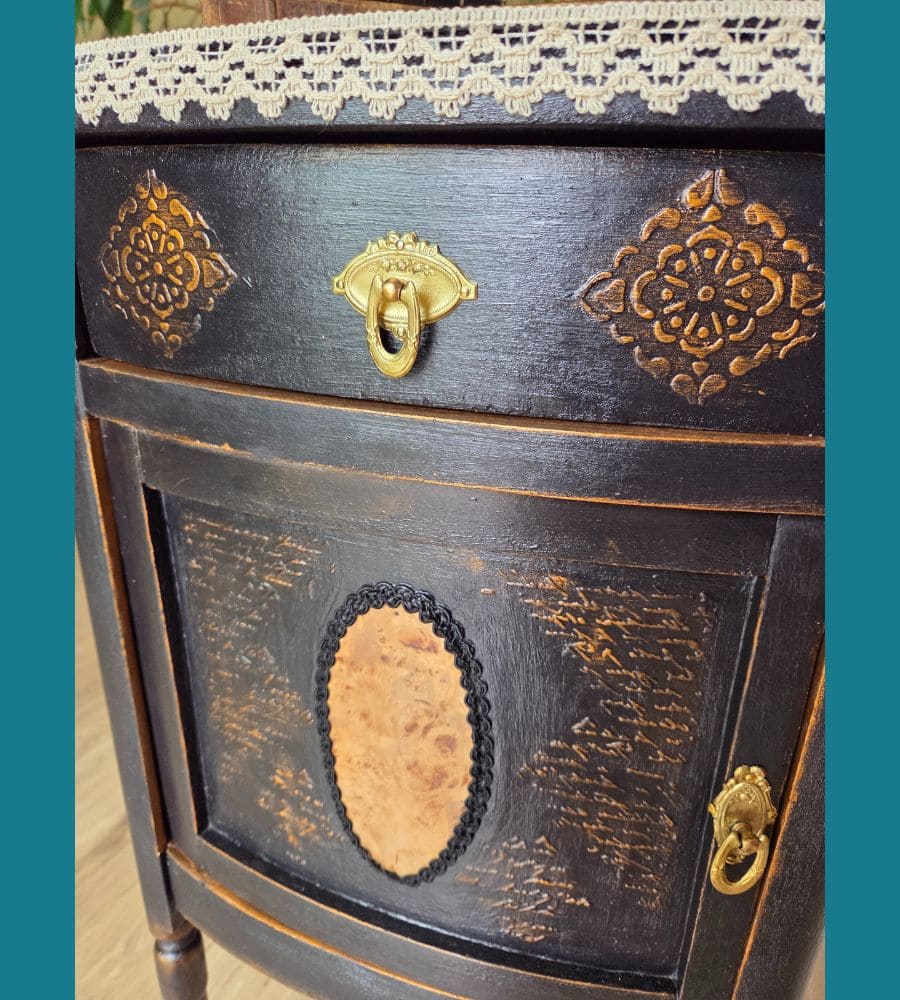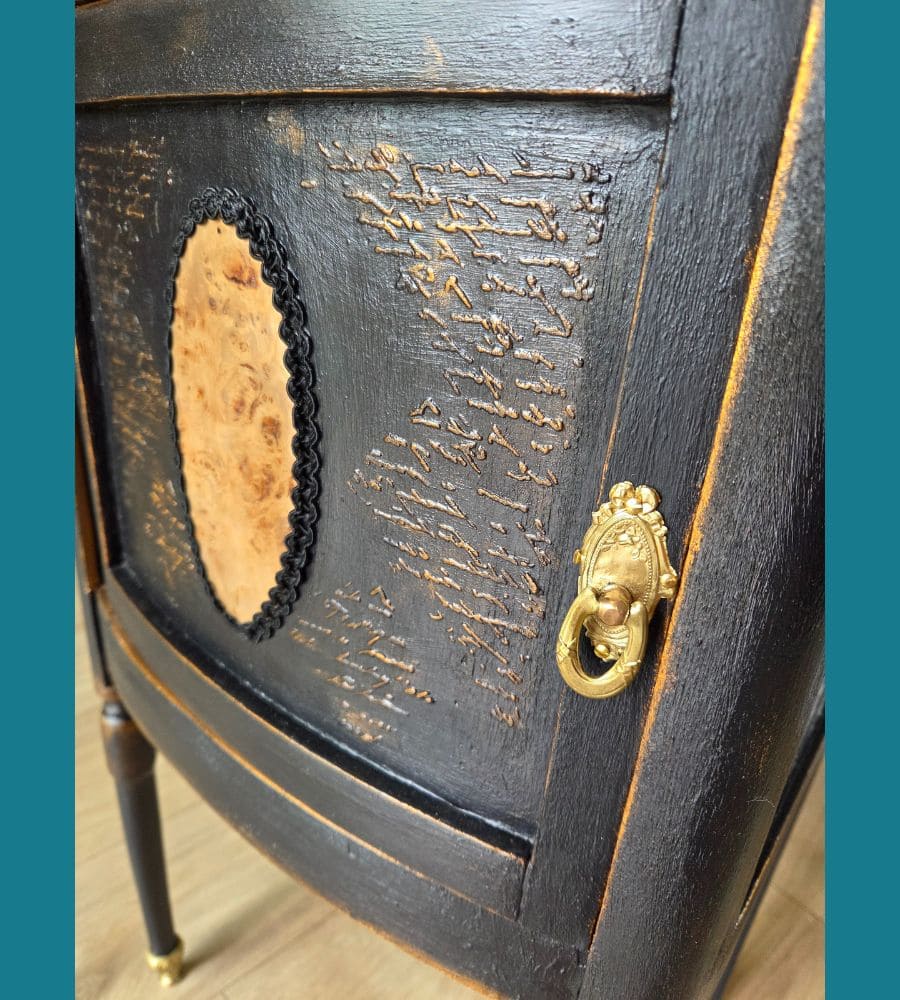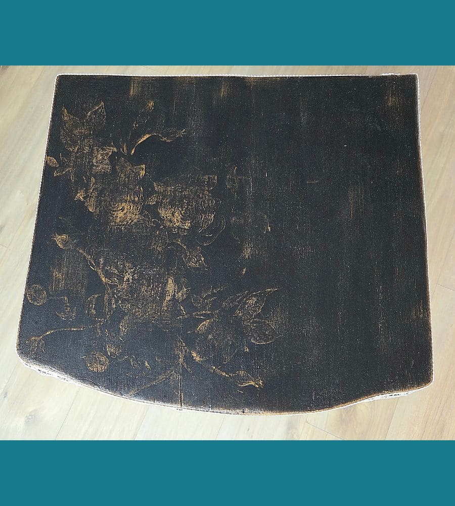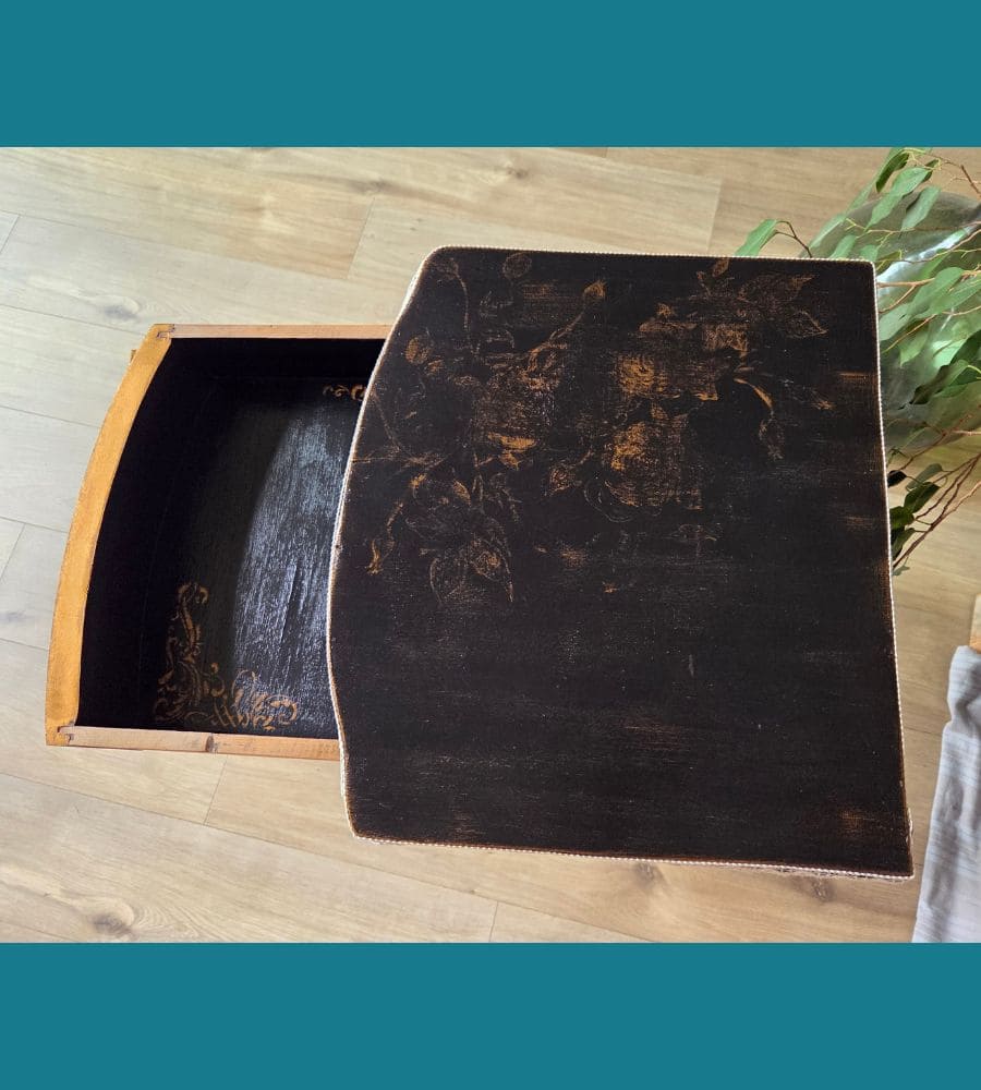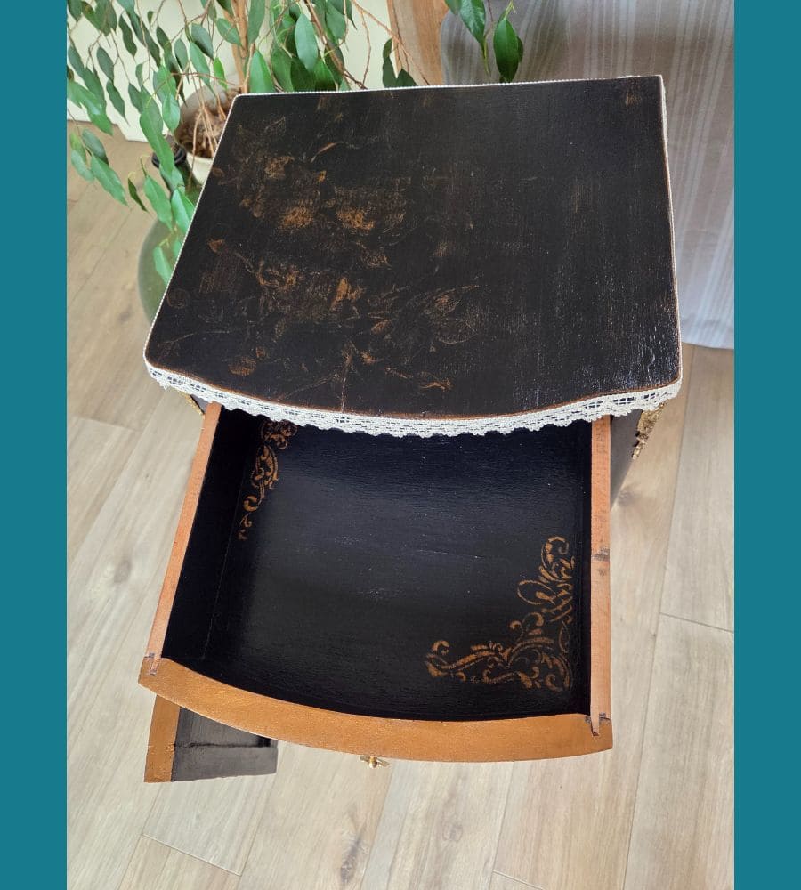 Des pochoirs à la cire sur le plateau et dans le tiroir, des motifs et textes en relief et un galon en dentelle de finition réhaussent son élégance d’origine.
