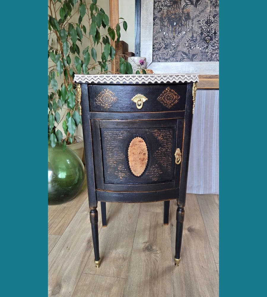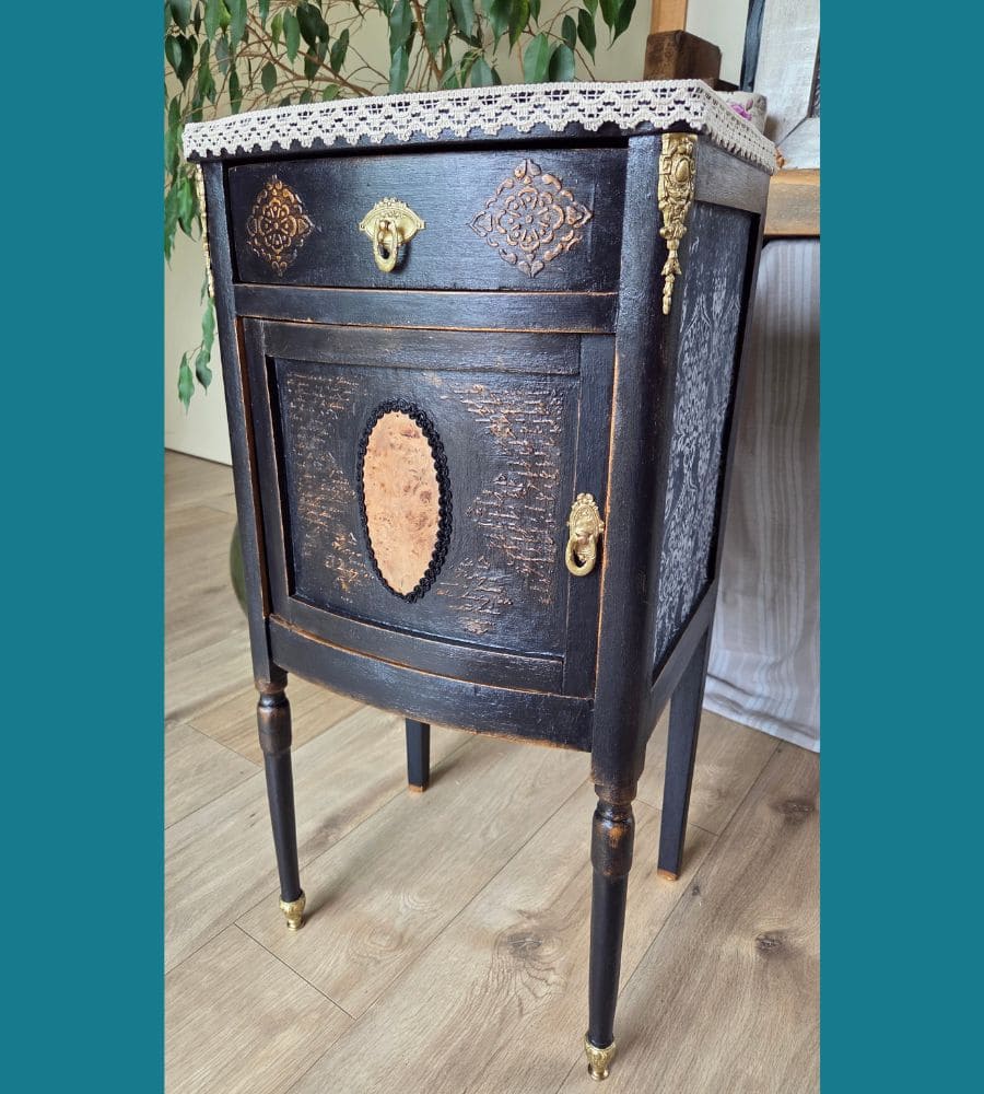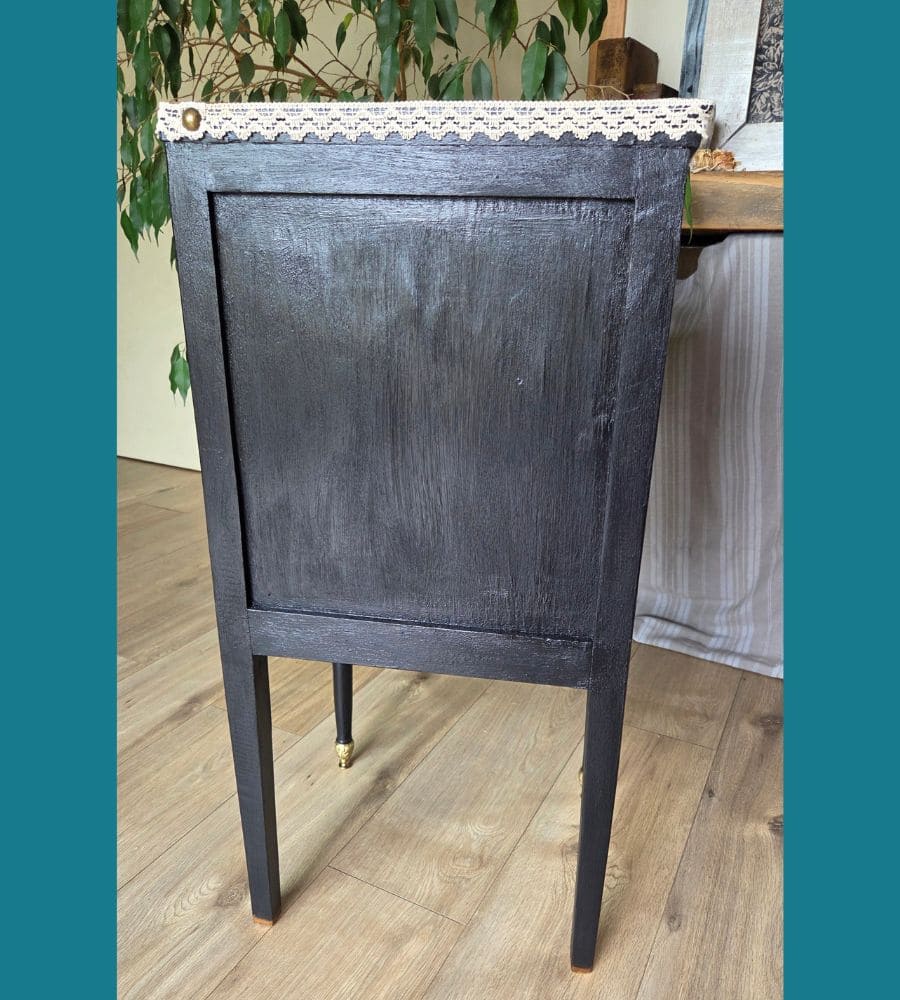 Peinture à la craie « Black athenian » pour un effet texturé et patiné et cire à dorer « or antique ».